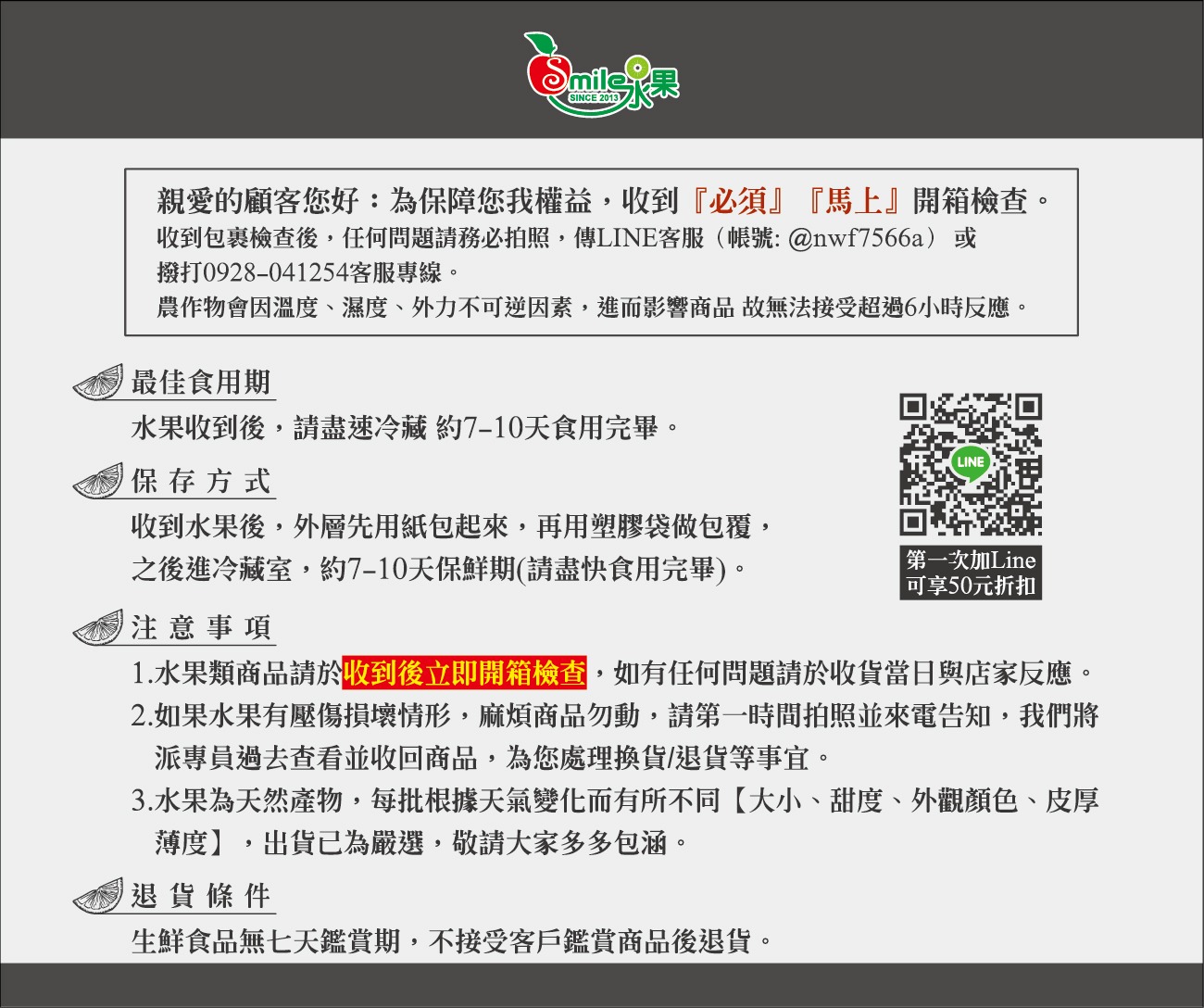 ⚠️ 注意事項:• 智利櫻桃可能有表面壓痕或天然生長紋路,屬正常現象,不影響食用品質。• 水果為天然農產品,大小、色澤、甜度、軟硬度皆可能略有差異。• 出貨前皆由人工挑選,仍可能有 2–3 顆輕微瑕疵果,屬合理範圍。• 收到商品請務必立即錄影開箱;如有缺件或嚴重瑕疵,請於 24 小時內提供照片/影片與客服聯繫。• 生鮮商品不適用 7 天鑑賞期,恕不接受因個人口感或外觀差異退換貨。【天然產物無法完全控管,完美主義者請斟酌下單】