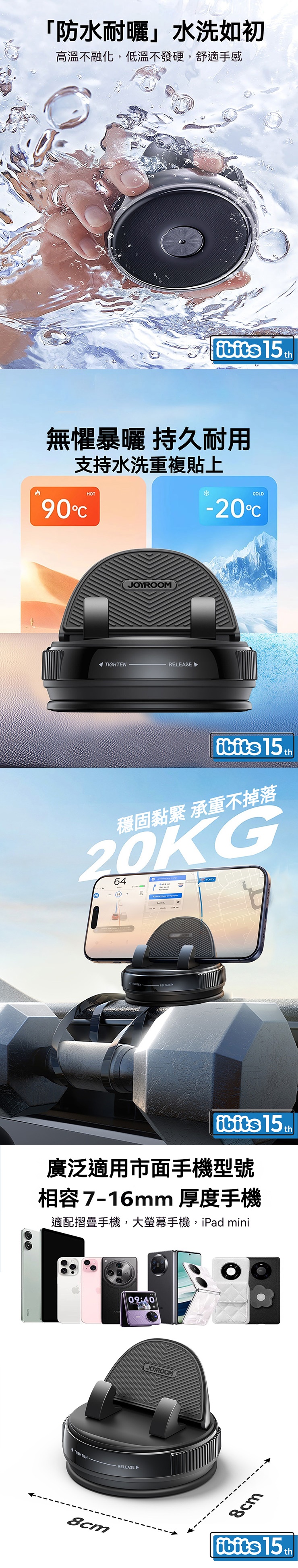 產品特點1. 旋轉鎖真空奈米吸盤2. 自適應伸縮卡扣設計3. 360°旋轉調節,25°垂直角度調節4. 單手操作,不擋視線,安裝方便5. 底座可水洗使用,移動位置不留痕6. 理線卡扣設計,充電更方便-----------------------------------------產品參數產品型號:JR-ZS530產品名稱:真空吸盤車用支架產品材質:PC+ABS適用尺寸:4.7-7英寸產品淨重:130g