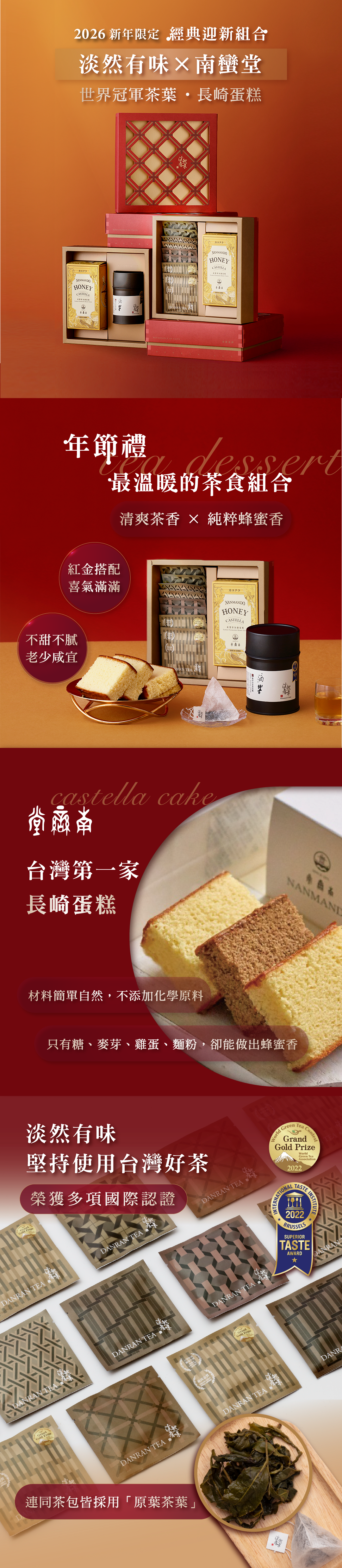 【禮盒內容物】.世界冠軍 四季春 袋茶包 2入.阿里山金萱烏龍 袋茶包 2入.三峽碧螺春綠茶 袋茶包 2入.頂級日月潭紅玉紅茶 袋茶包 2入.南蠻堂長崎蛋糕 200g (經典原味口味)