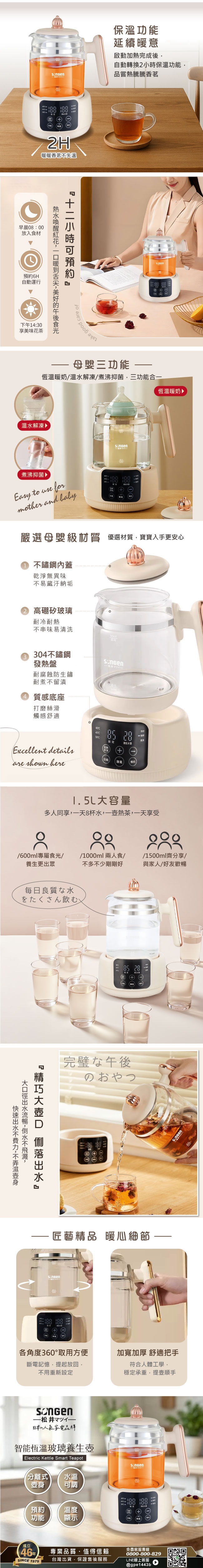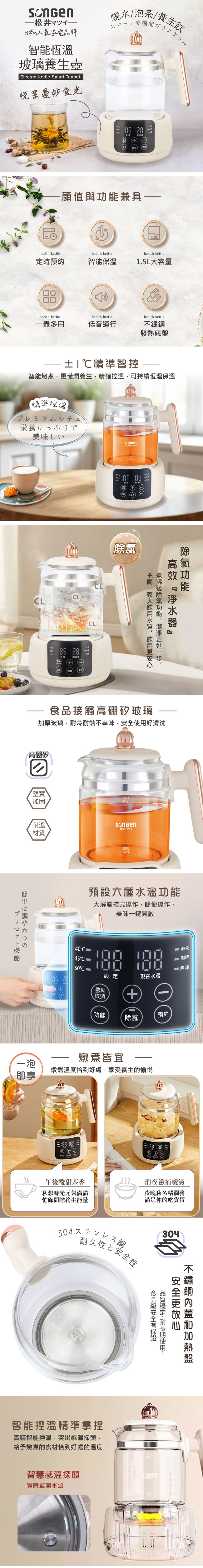 商品特色煮水/泡茶/養生湯/沖咖啡多功能 食品級304#不銹鋼底盤 六種水溫設定精準控溫 2小時長效定時定溫烹煮 煮沸、無水斷電防乾燒 耐熱防爆透明玻璃壺身商品規格商品品牌:SONGEN松井 商品型號:SG-A16E 商品名稱:1.5L智能恆溫玻璃電熱養生壺額定電壓及額定頻率:110V/60Hz 總額定消耗電功率:900W 商品尺寸:寬200x深180x高260mm 商品重量:1.2kg 總 容 量:1.5L 產品保證:明台產物保險2000萬產品責任險 BSMI商品認證字號:R73998商品保固:一年保固