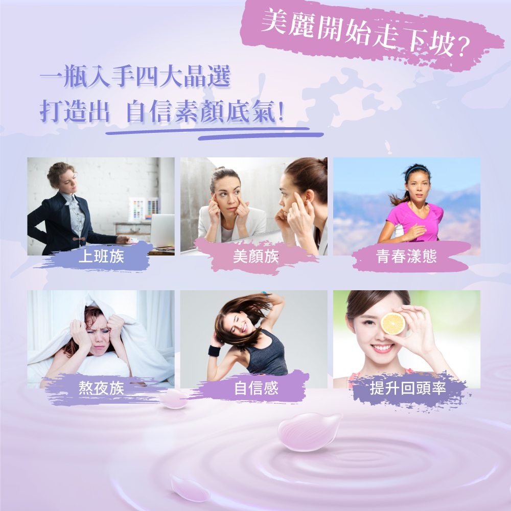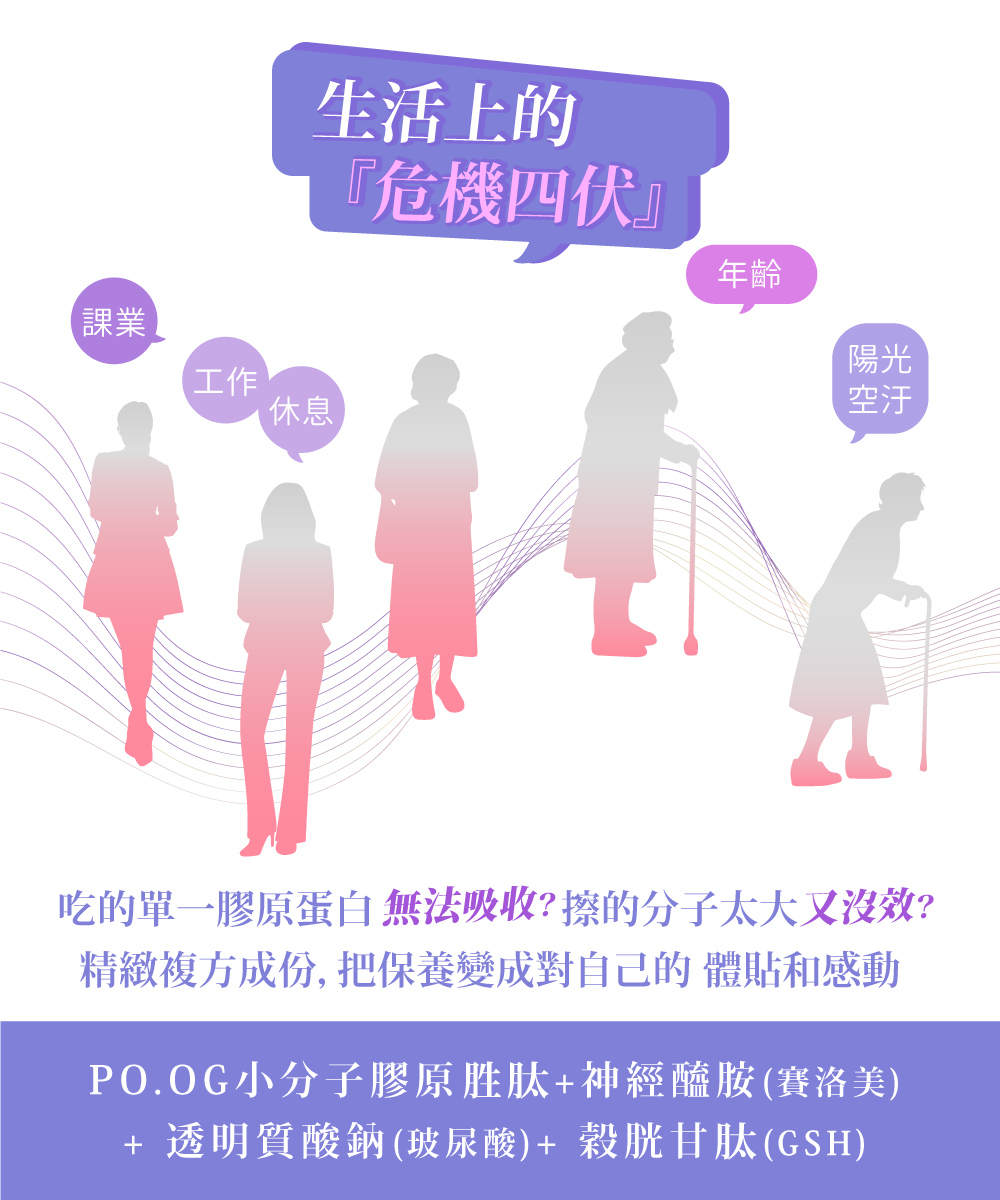 成分:魚膠原蛋白、微結晶狀α-纖維素、聚乙烯?咯烷酮、膜衣(聚乙烯醇、二氧化鈦、聚乙二醇、滑石粉)、二氧化矽、硬脂酸鎂、穀胱甘(月太)、流行鏈球菌發酵物(含透明質酸鈉)、玄米萃取物(玉米糊精、米抽出物)