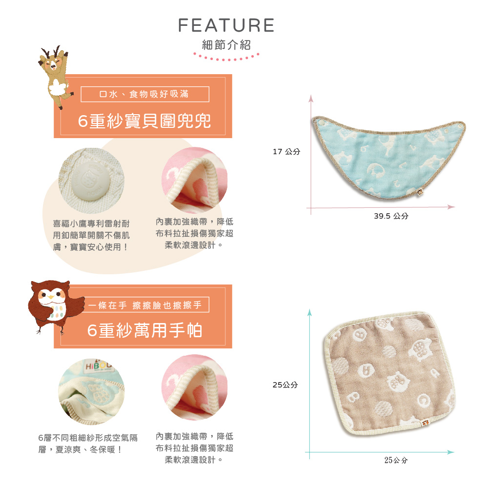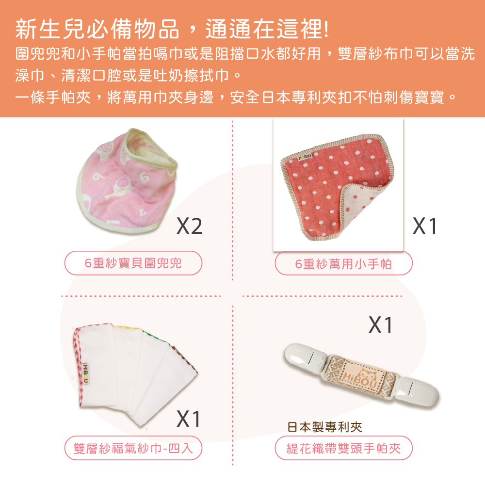 喜福小鷹來報喜,新生彌月禮盒我最派初生必備彌月禮盒新生兒最必買推薦 新手媽咪不慌張!新生兒必備物品,通通在這裡。圍兜兜和小手帕當拍嗝巾或是阻擋口水都好用,雙層紗布巾可以當洗澡巾、清潔口腔或是吐奶擦拭巾。一條手帕夾,將萬用巾夾身邊,安全日本專利夾扣不怕刺傷寶寶。【內容物包含】●6重紗圍兜兜 x2●6重紗萬用小手帕 x1●緹花織帶雙頭手帕夾x1●雙層紗布巾x4條※無紙袋、卡片環保簡易包裝