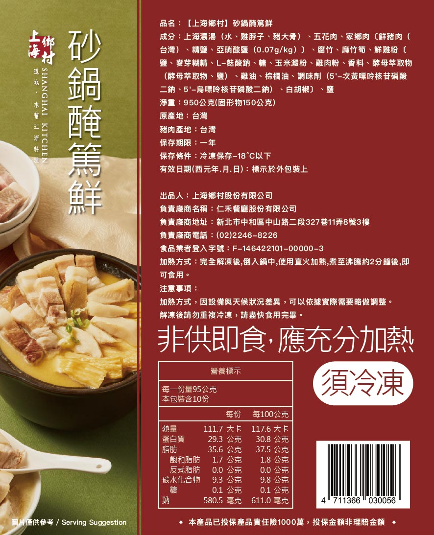 1.商品組合/規格:【上海鄉村】砂鍋醃篤鮮(950g/固形物150g) x2包組
