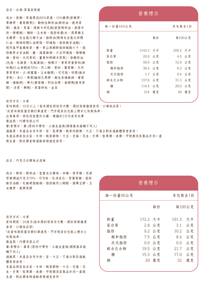商品內容名稱:白雪草莓捲+巧克力白蘭地冰淇淋組貨號:9905006201材質:食品尺寸:杯裝冰淇淋直徑約7公分,高約6公分