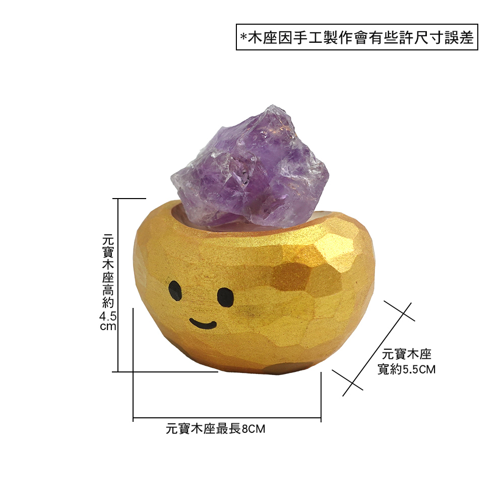 礦石採自行黏貼設計,可依喜好調整角度與層次;手工木雕元寶每件紋理皆獨一無二,天然紫水晶大小、形狀、色澤略有差異更具收藏感。Q萌元寶寶一擺就有好心情,自用送禮兩全其美,不容錯過的高顏值開運療癒系小物。
