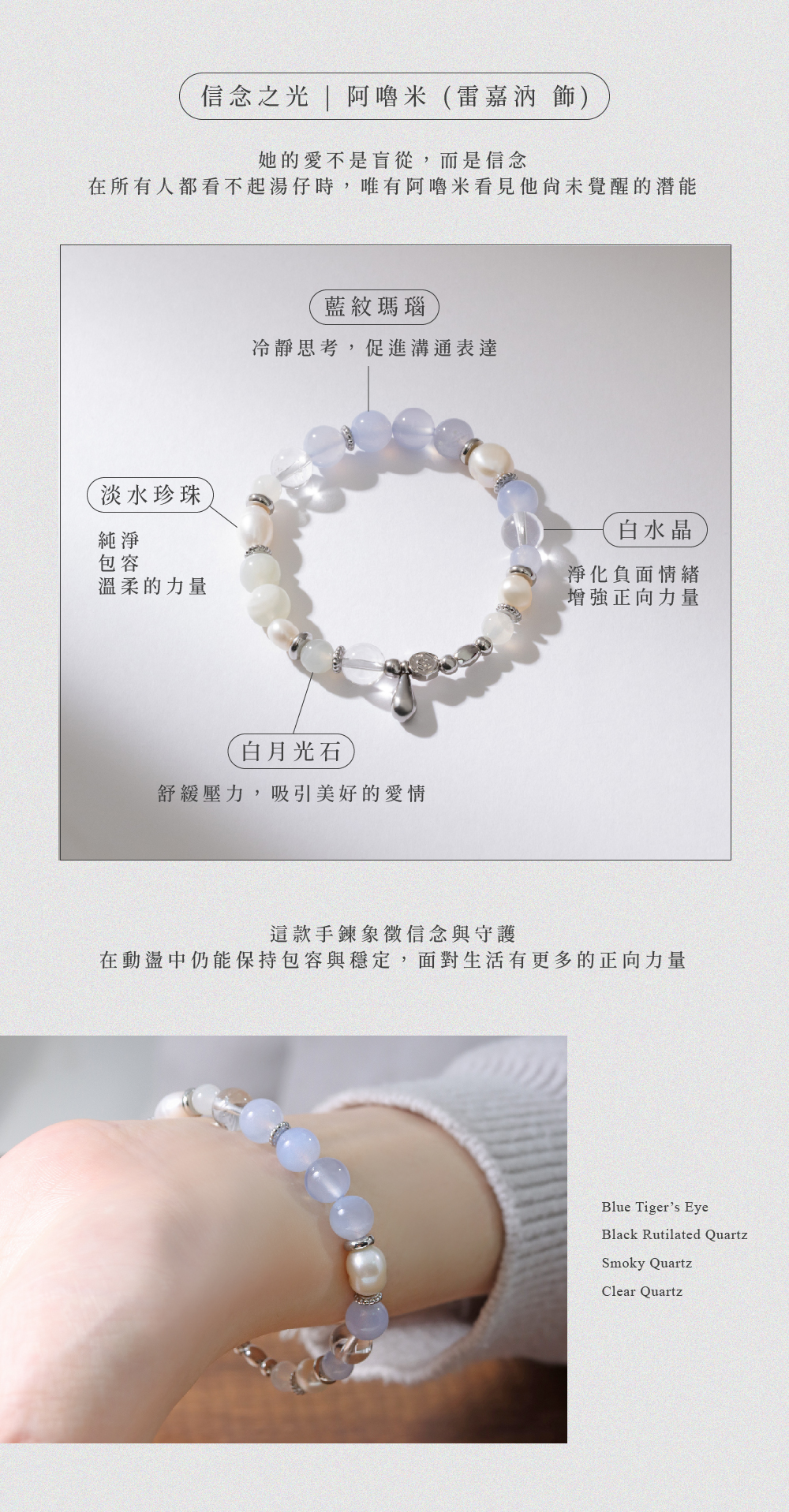 ◦ 藍紋瑪瑙 | 療癒內心, 消除疲勞, 促進溝通表達◦ 月光石 | 穩定情緒, 舒緩壓力, 守護愛情◦ 淡水珍珠 | 圓滿, 思緒清晰, 撫平焦躁◦ 白水晶 | 淨化消磁, 增加正能量, 提升專注力