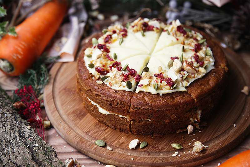 使用新鮮胡蘿蔔切絲,核桃,肉桂,荳蔻,混入蛋糕麵糊裡面