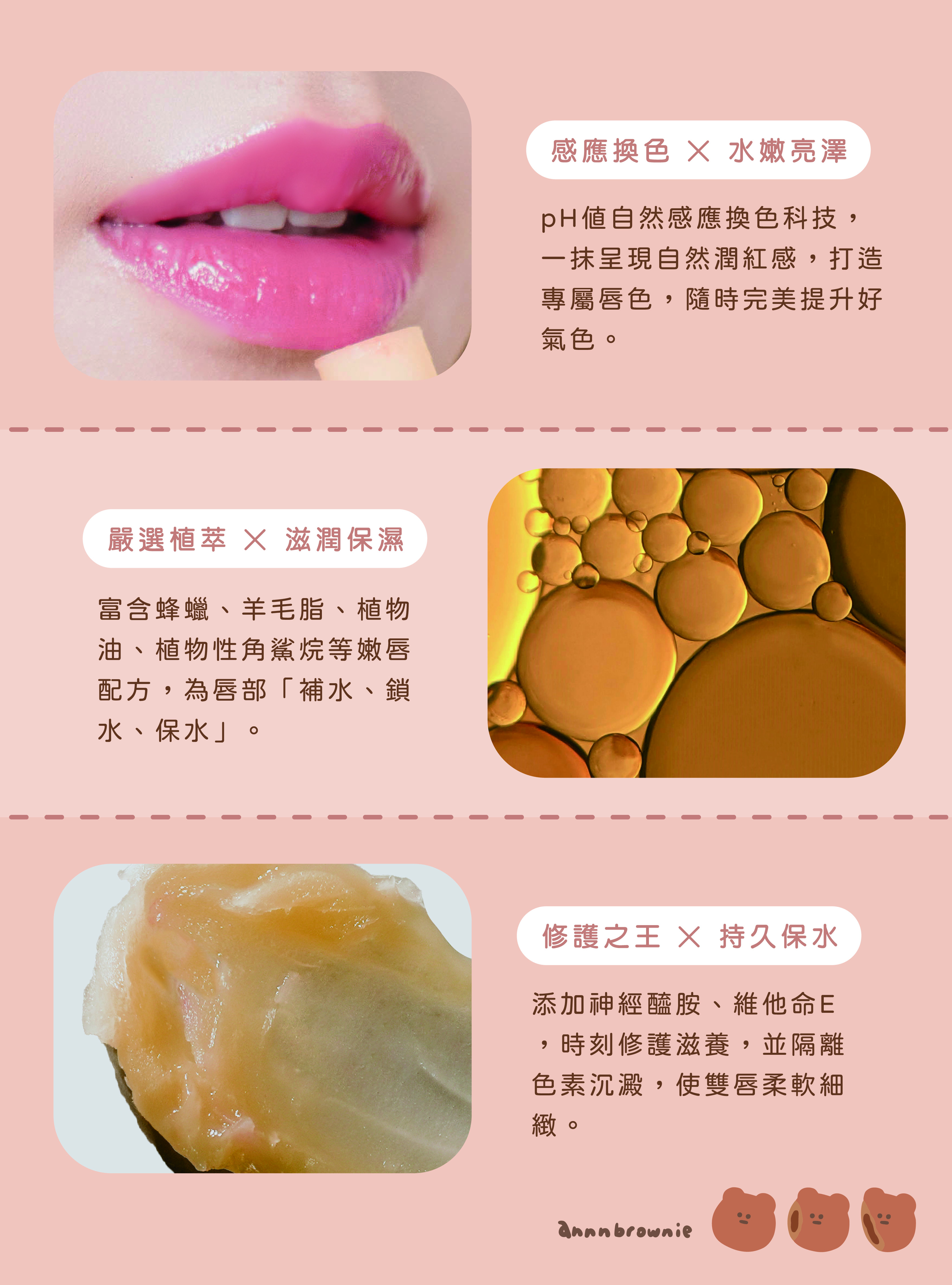 高效潤澤+自然潤色添加植物性角鯊烷、神經醯胺及植物油萃取等嫩唇配方,時刻為唇部進行補水、鎖水、保水三重深層修護,加上獨特的pH值換色科技,打造自然粉嫩好感唇色。