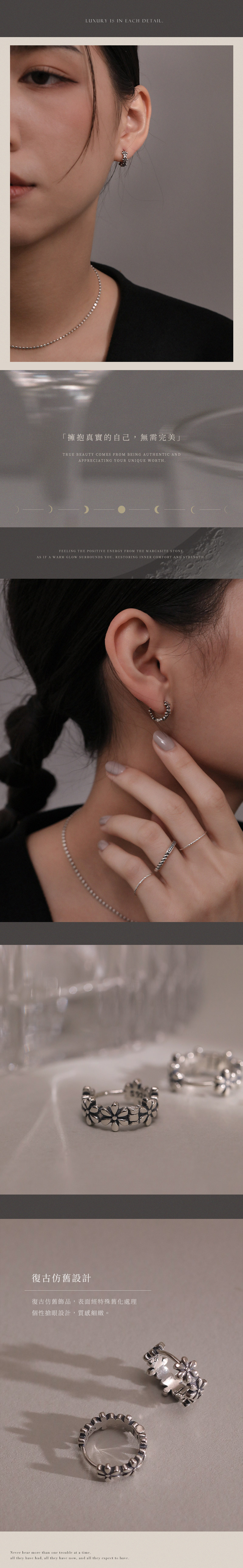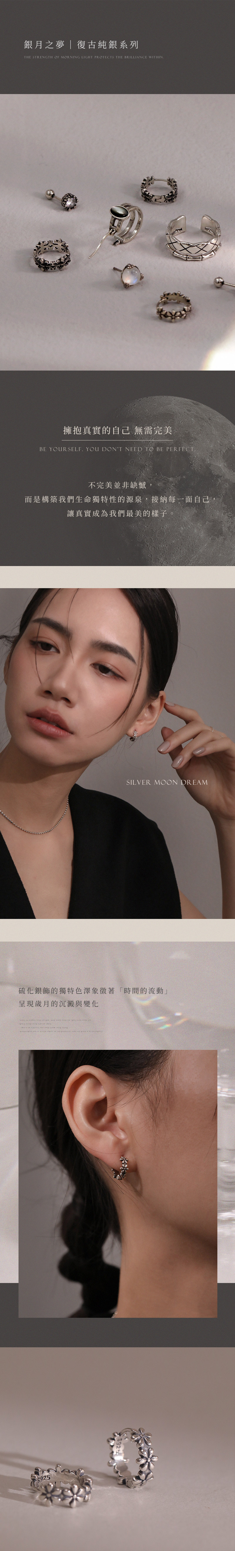 每一件飾品都是一種提醒——我們不需要完美,依然能擁有屬於自己的光輝與力量。戴上「銀月之夢」,感受月光般的溫暖擁抱,讓心靈沉澱,閃耀出最真實動人的美麗。