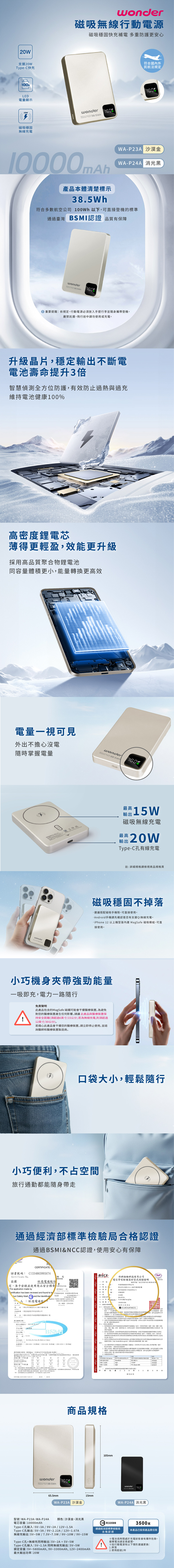 型號:WA-P23A商檢合格字號:R33599NCC型式認證碼:CCAP25LP5442T2顏色:沙漠金Type-C孔輸入:5V⎓3A / 9V⎓2A / 12V⎓1.5AType-C孔輸出:5V⎓3A / 9V⎓2.22A / 12V⎓1.67A無線充輸出:5V⎓5W / 7.5V⎓7.5W / 9V⎓10W / 9V⎓15WType-C孔 + 無線充同時輸出:5V⎓2A + 5V⎓5WType-C孔輸入:5V⎓1.5A 同時無線充輸出:5V⎓5W最大輸出功率:20W額定容量:5V⎓5800mAh/9V⎓3300mAh/12V⎓2400mAh單品重量:約 0.183Kg單品尺寸(mm):65.5X15X105彩盒尺寸(mm):85X125X35國際條碼:4710577767010商品原產地:中國大陸