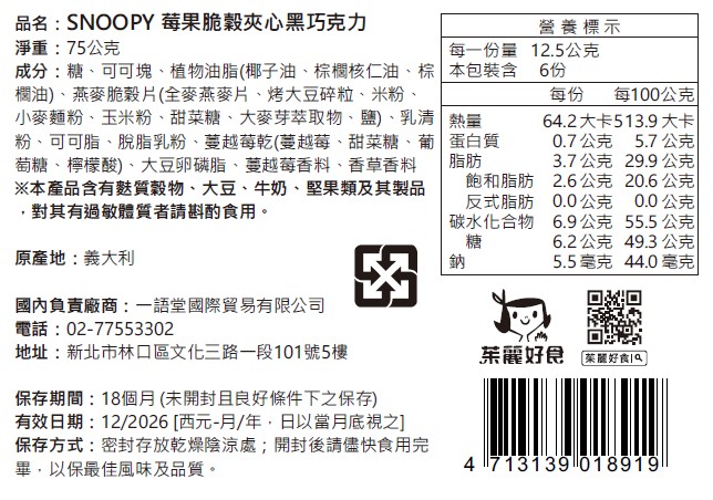 名稱 : 【CupiCho 丘彼巧】SNOOPY 莓果脆穀夾心黑巧克力