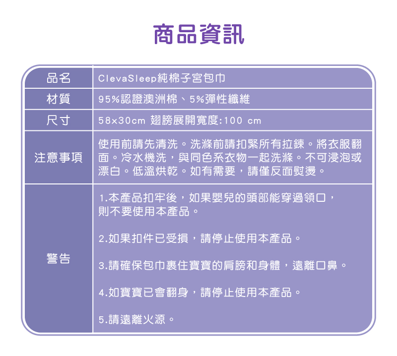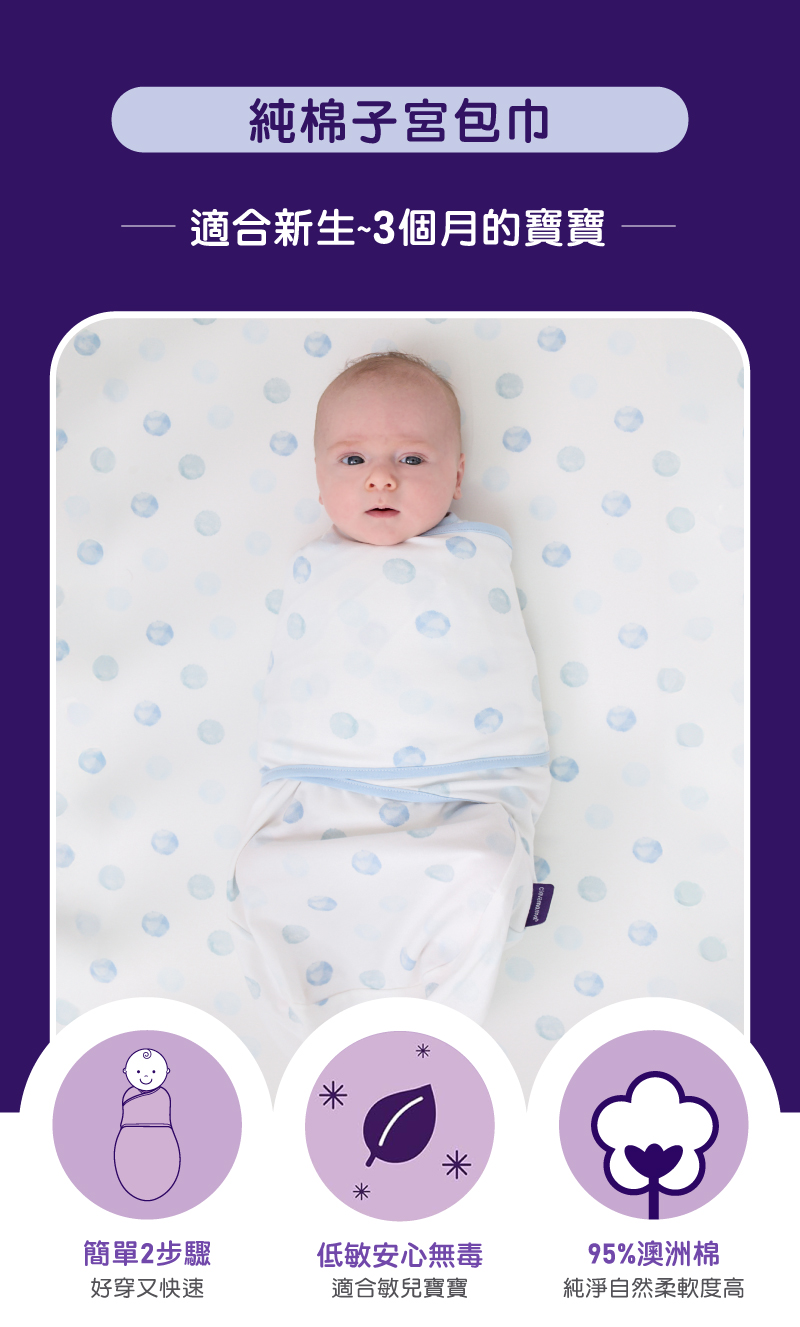 ■商品說明:如何使用(請見圖1、2、3)1. 將寶寶放進包巾2. 將包巾的翅膀部分,從一邊包向另一邊,確保包好寶寶的手,並從寶寶的下巴通過3. 將另一邊包好,並確保本產品沒有蓋住寶寶的口鼻。請不要包得太緊,留一些空間讓寶寶的腿可以彎曲活動