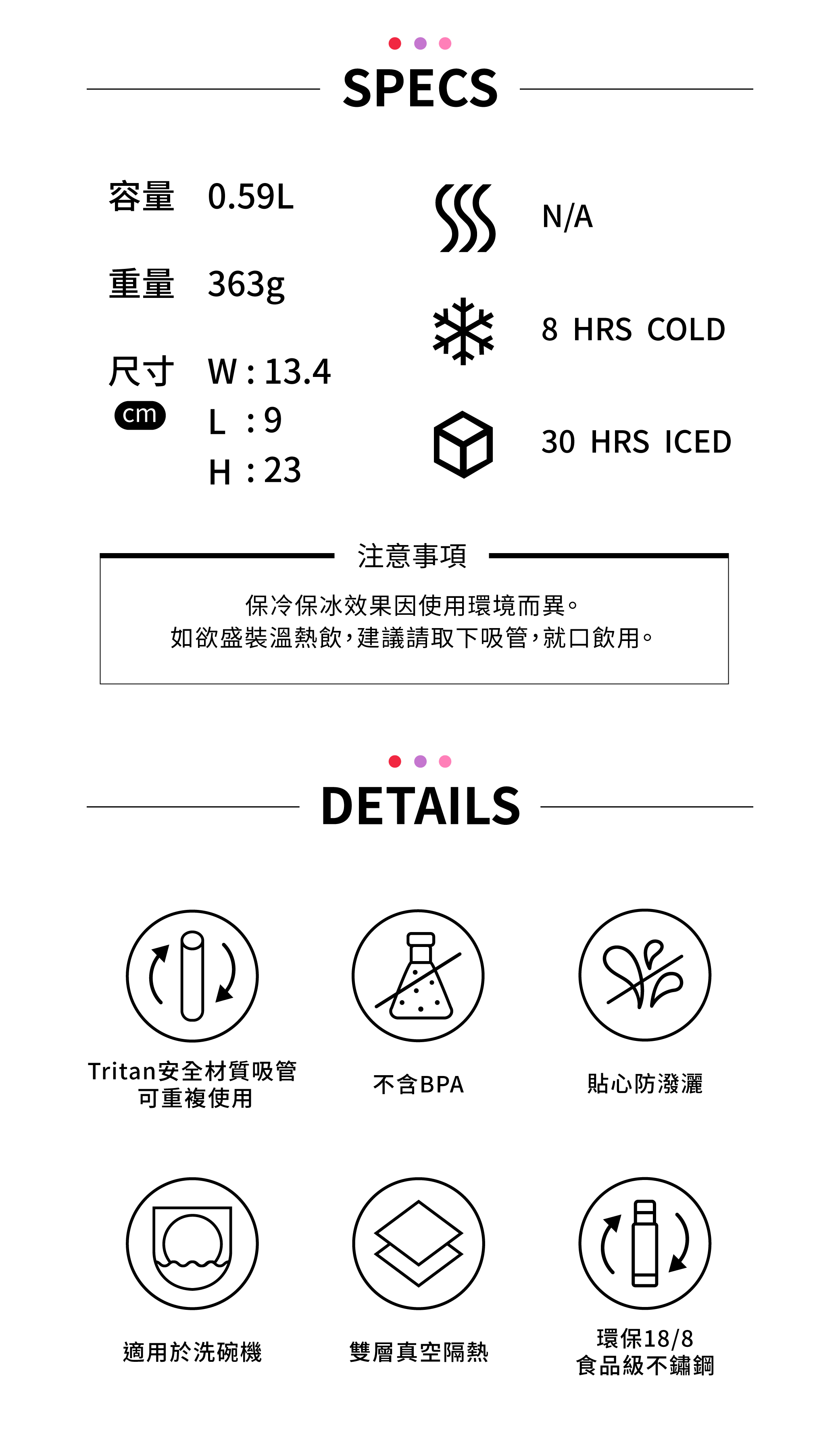 杯身: 18/8 (304) 食品級不銹鋼,不含 BPA