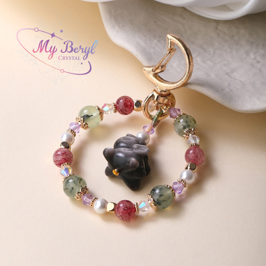 🐎 銀曜石小馬 × 草莓晶 × 葡萄石 × 貝珠|勇氣與幸運的守護吊飾 ✨