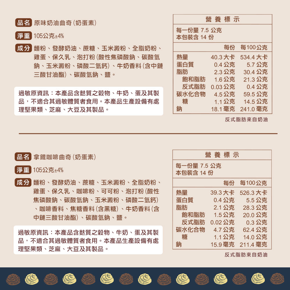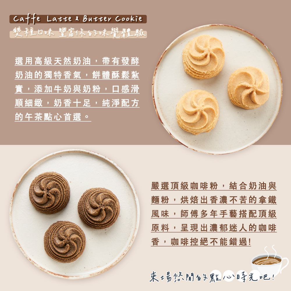 ✔️拿鐵咖啡曲奇:使用頂級咖啡粉,持久的咖啡香氣與麵粉、奶油相互搭配、陪襯,師傅數十年的經驗與手藝搭配最頂級的原料,呈現最真實的口味,喜歡醇厚拿鐵咖啡味的朋友絕對不要錯過!