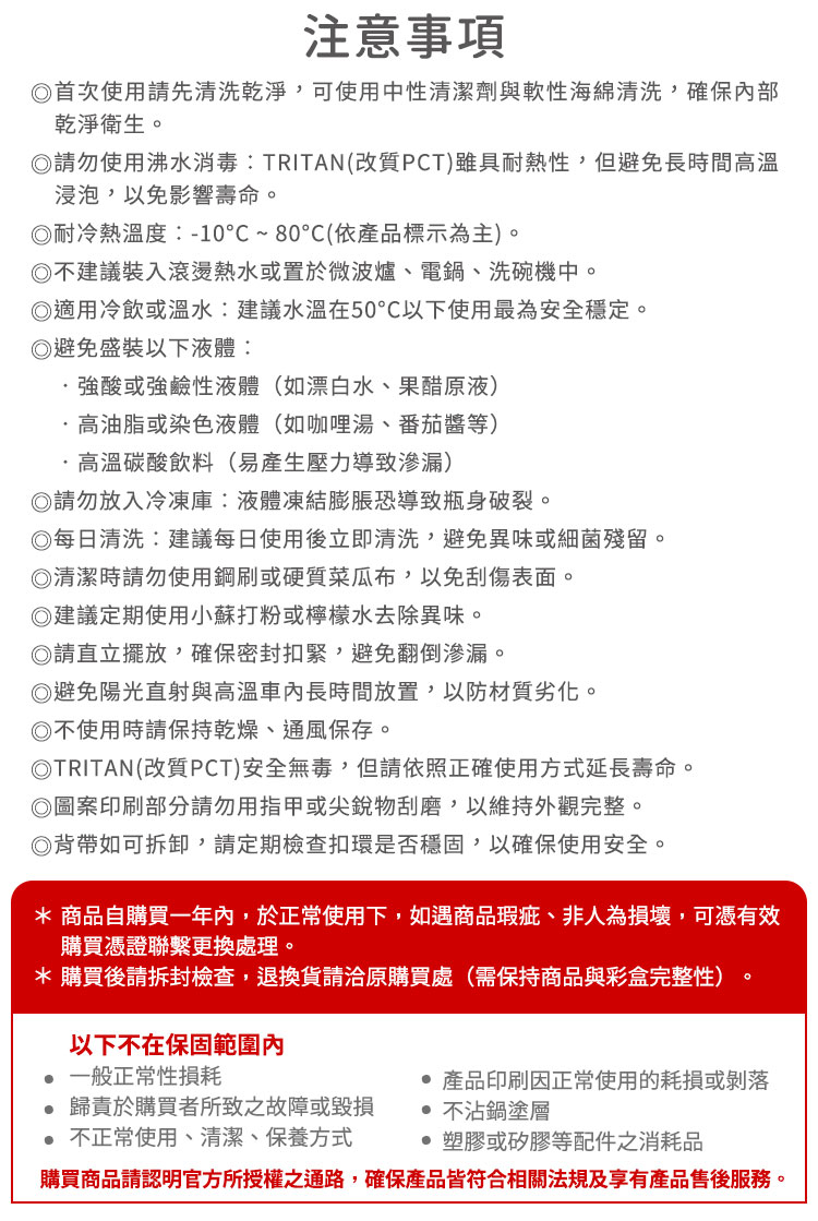 材 質:瓶身/TRITAN(改質PCT,耐熱-10˚C~80˚C)
