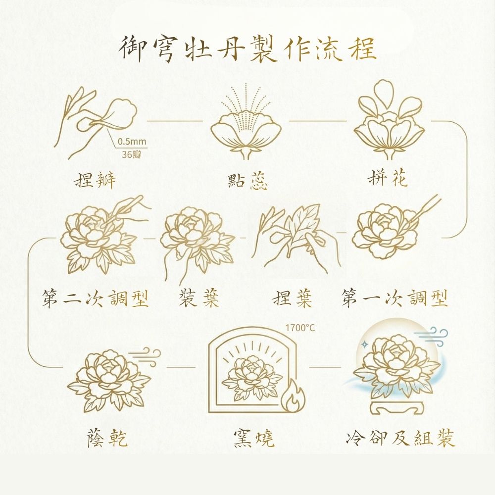 以象徵富貴吉祥的牡丹為靈感,手工捏製陶瓷牡丹花,
