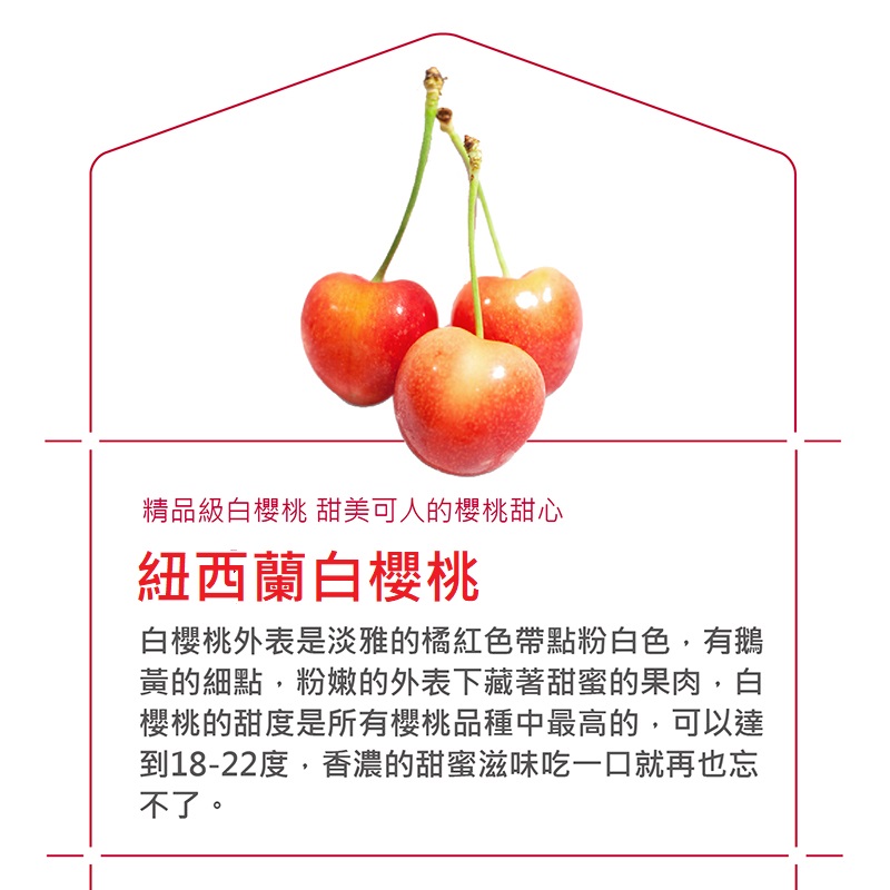 紐西蘭極鮮空運來台,Premium等級的大嘴巴櫻桃,盛產期僅在每年12月-2月,由專人在上4點至11點的黃金時段以人工方式採收後送至包裝工廠,4°C低溫流動清水清洗、人工精心選果後速配機場,第一手體驗櫻桃界的LV!