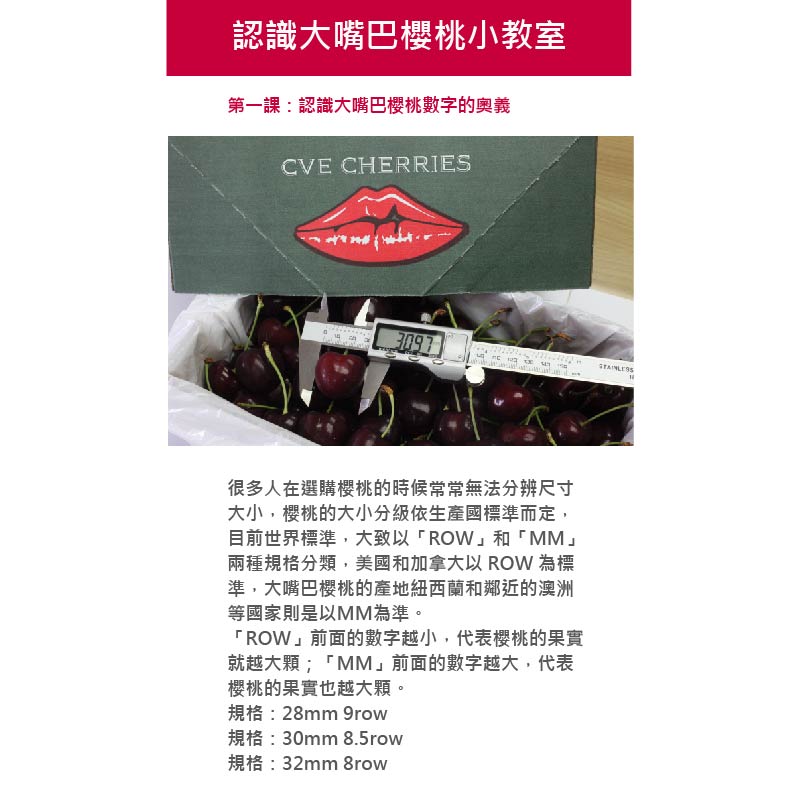 紐西蘭極鮮空運來台,Premium等級的大嘴巴櫻桃,盛產期僅在每年12月-2月,由專人在上4點至11點的黃金時段以人工方式採收後送至包裝工廠,4°C低溫流動清水清洗、人工精心選果後速配機場,第一手體驗櫻桃界的LV!