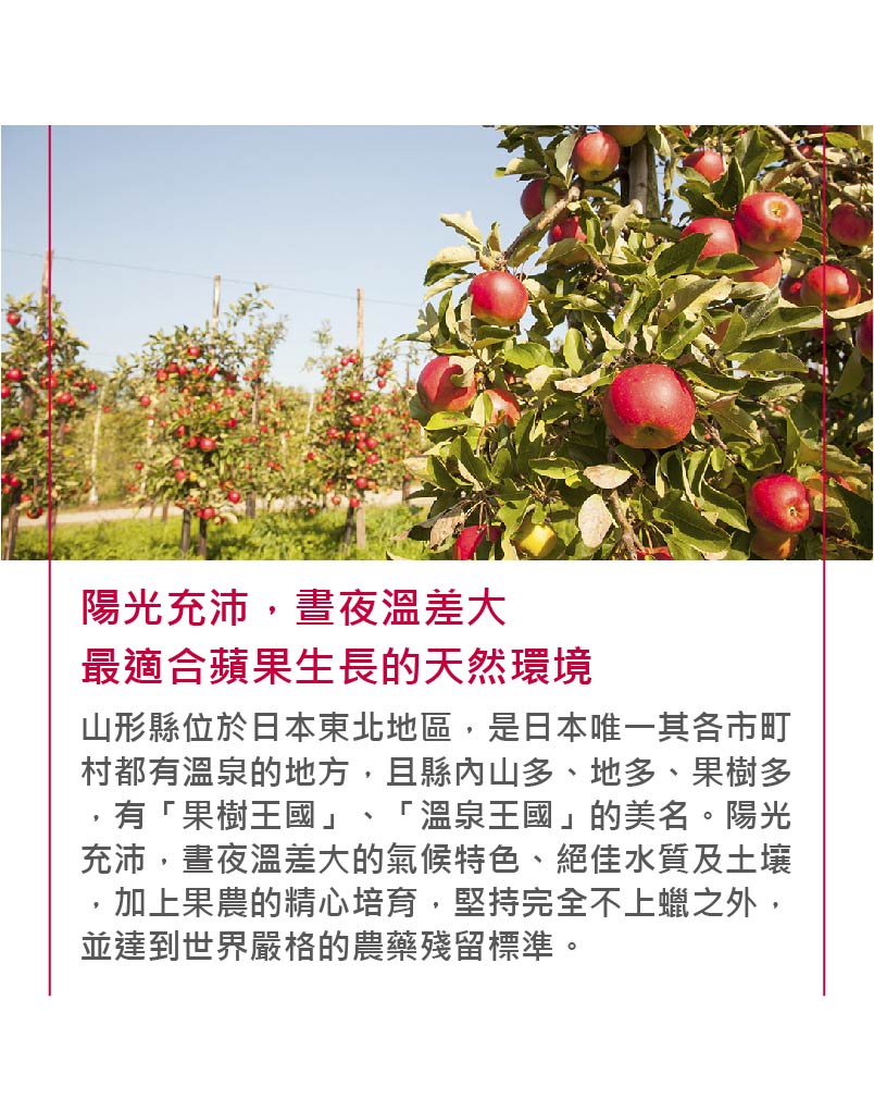 加上日本青森得天獨厚的風土和高溫差,讓陽光富士常常切開後出現誘人的結蜜。濃濃的蜂蜜香氣、又甜又脆,陽光蜜富士因此成為制霸日本蘋果的王牌品種。沒試過日本蘋果的話,一定要從蜜富士開始。嘗過蜜富士的甜蜜滋味,一定會愛上這樣的好味道。
