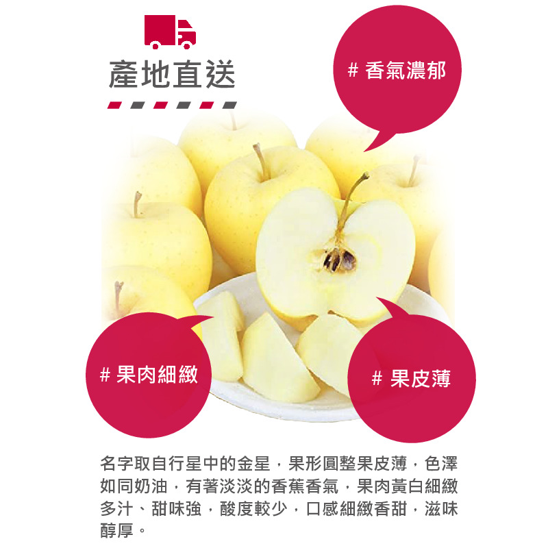外表不同於一般蘋果鮮紅欲滴或是青翠鮮綠,而是呈現粉嫩淡黃的特有色澤,又稱「黃金蘋果」或「牛奶蘋果」,在日本,經常出現在婚宴的喜慶典禮中,在台灣因為討喜如同元寶般的金黃色,更是熱門送禮選擇。