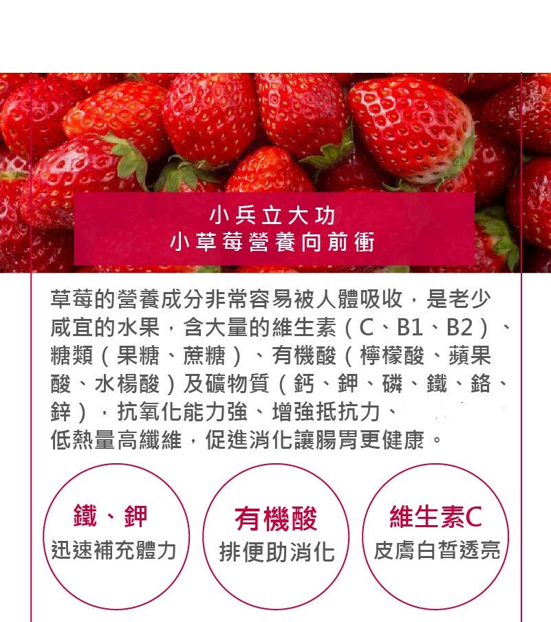 草莓屬薔薇科草本植物,果實富含維他命C,素有「活的維他命C結晶」之美譽。