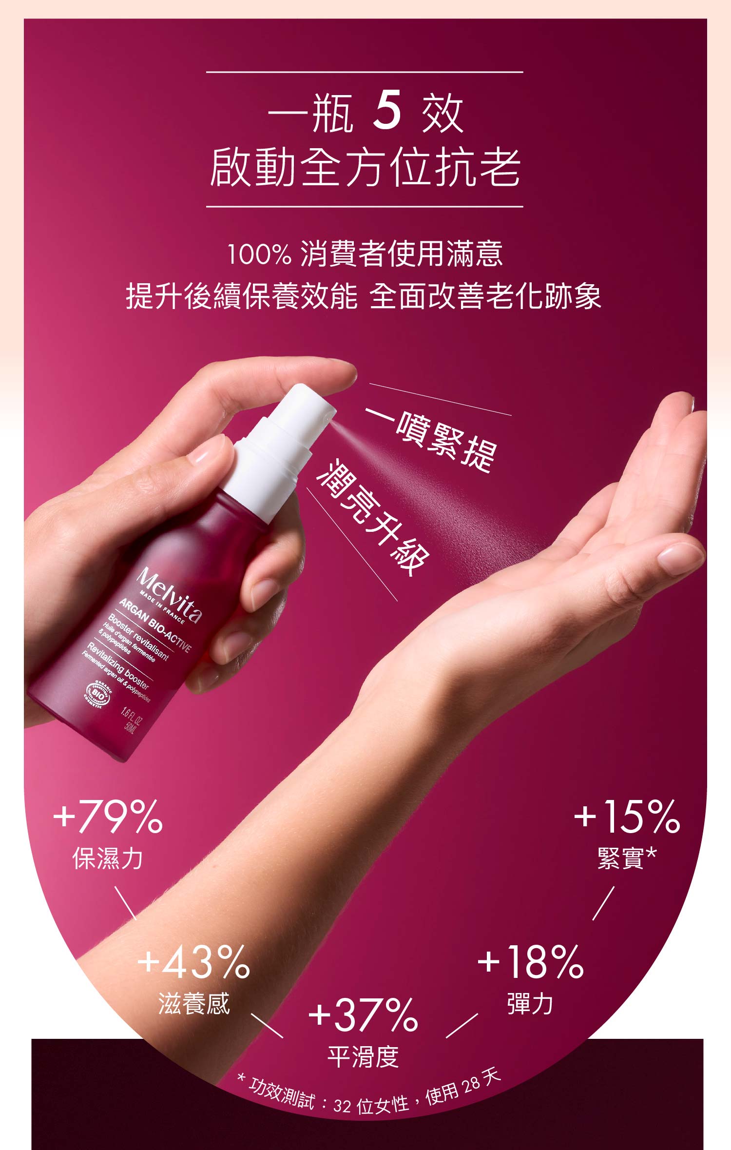 摩洛哥堅果活酵緊提雙效露 - 這款油、水雙配方融合了發酵摩洛哥堅果油和米蛋白胜肽,能夠強化肌膚屏障,讓肌膚光滑緊緻。能迅速融入肌膚,補充水分和營養,讓肌膚倍感舒適。→建議使用方法:早晚清潔後使用,使用前搖勻。噴於手心後塗抹於臉部,以指腹輕柔按摩至吸收。