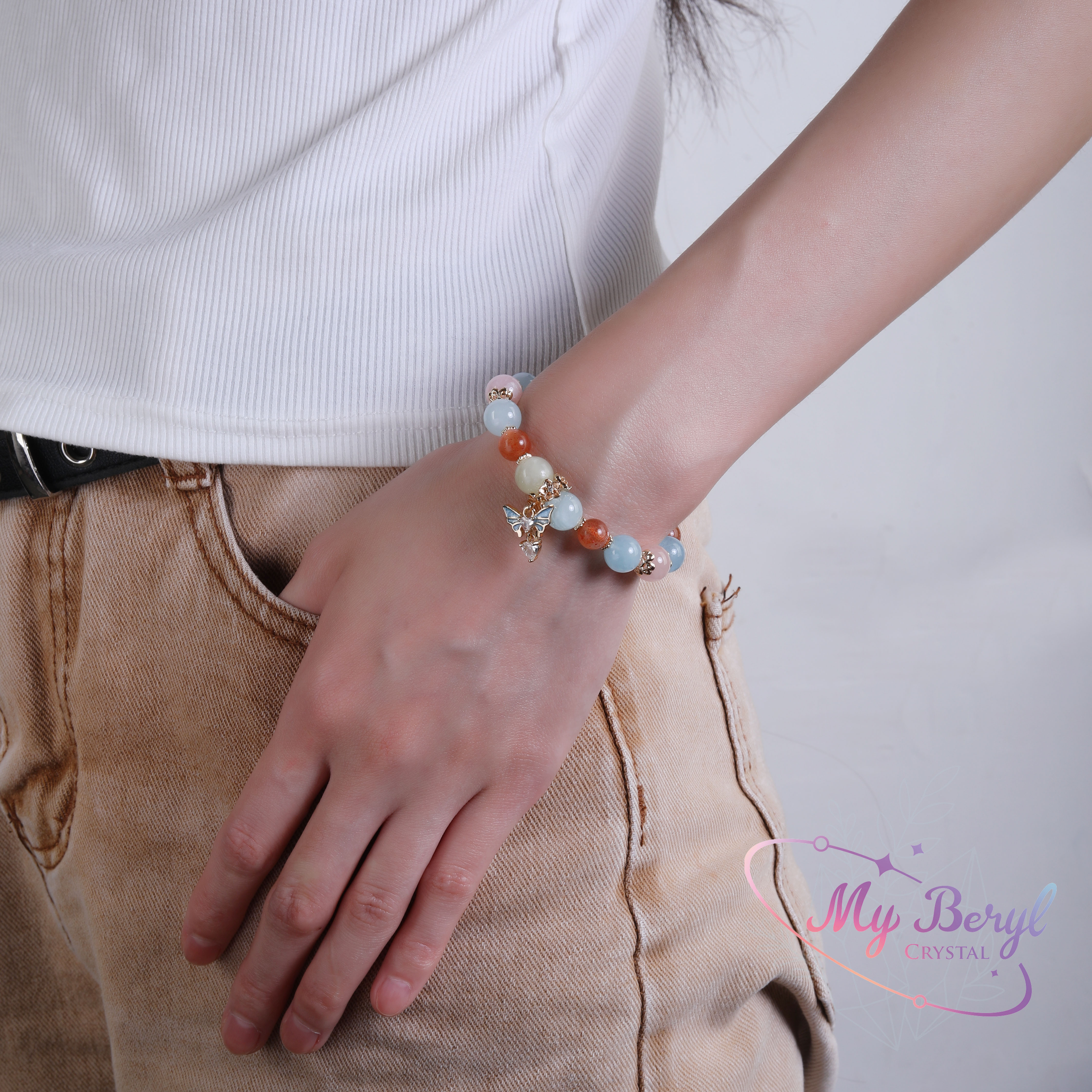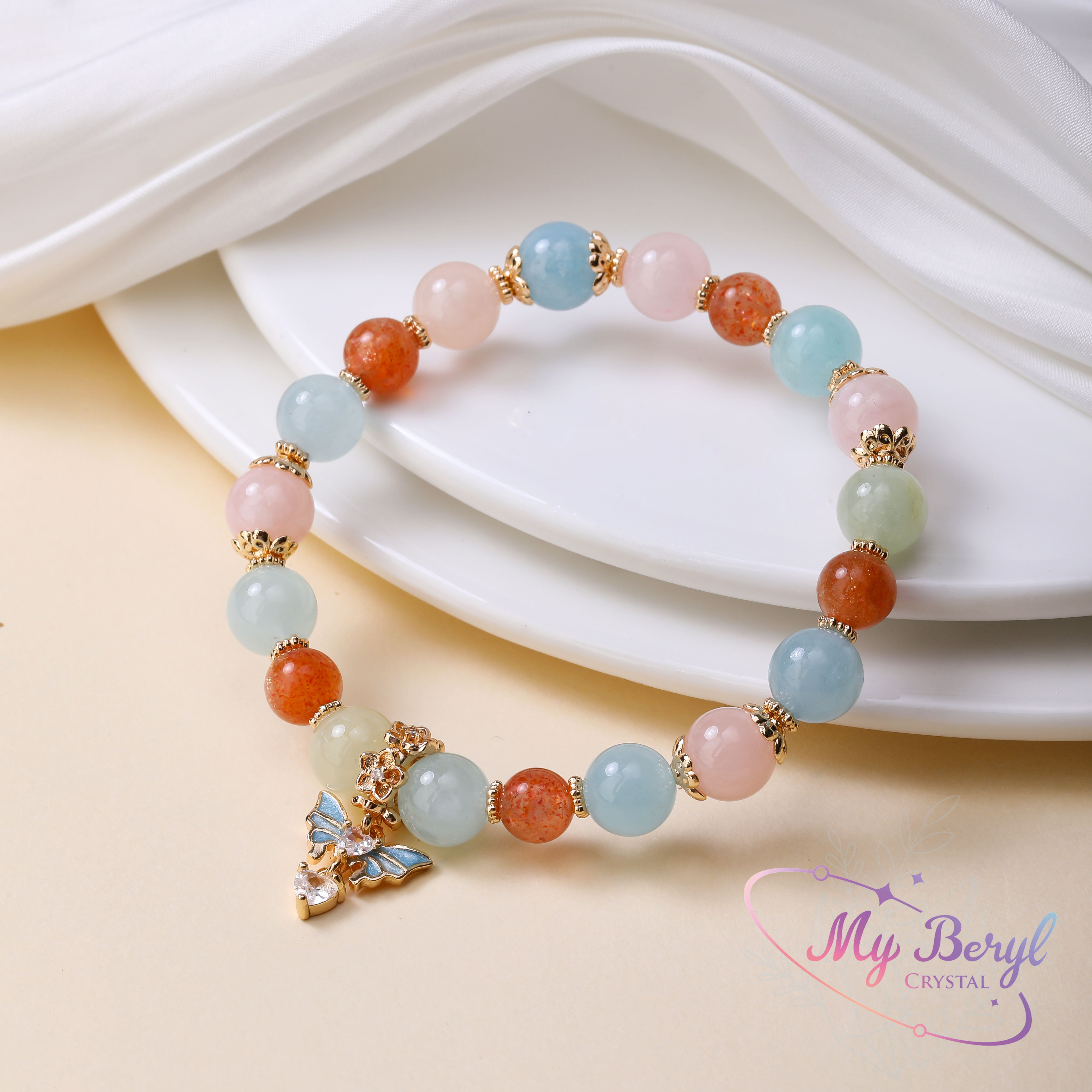 🌸 摩根石:愛情與幸福之石,散發柔美氣質,助於吸引美好人緣。☀️ 金太陽:象徵熱情與活力,增添自信與好運,帶來陽光能量。🌊 海藍寶:勇氣與溝通之石,讓思緒清晰,增進人際和諧。🦋 蝴蝶墜飾:代表蛻變與希望,寓意展翅飛翔、迎接新生。