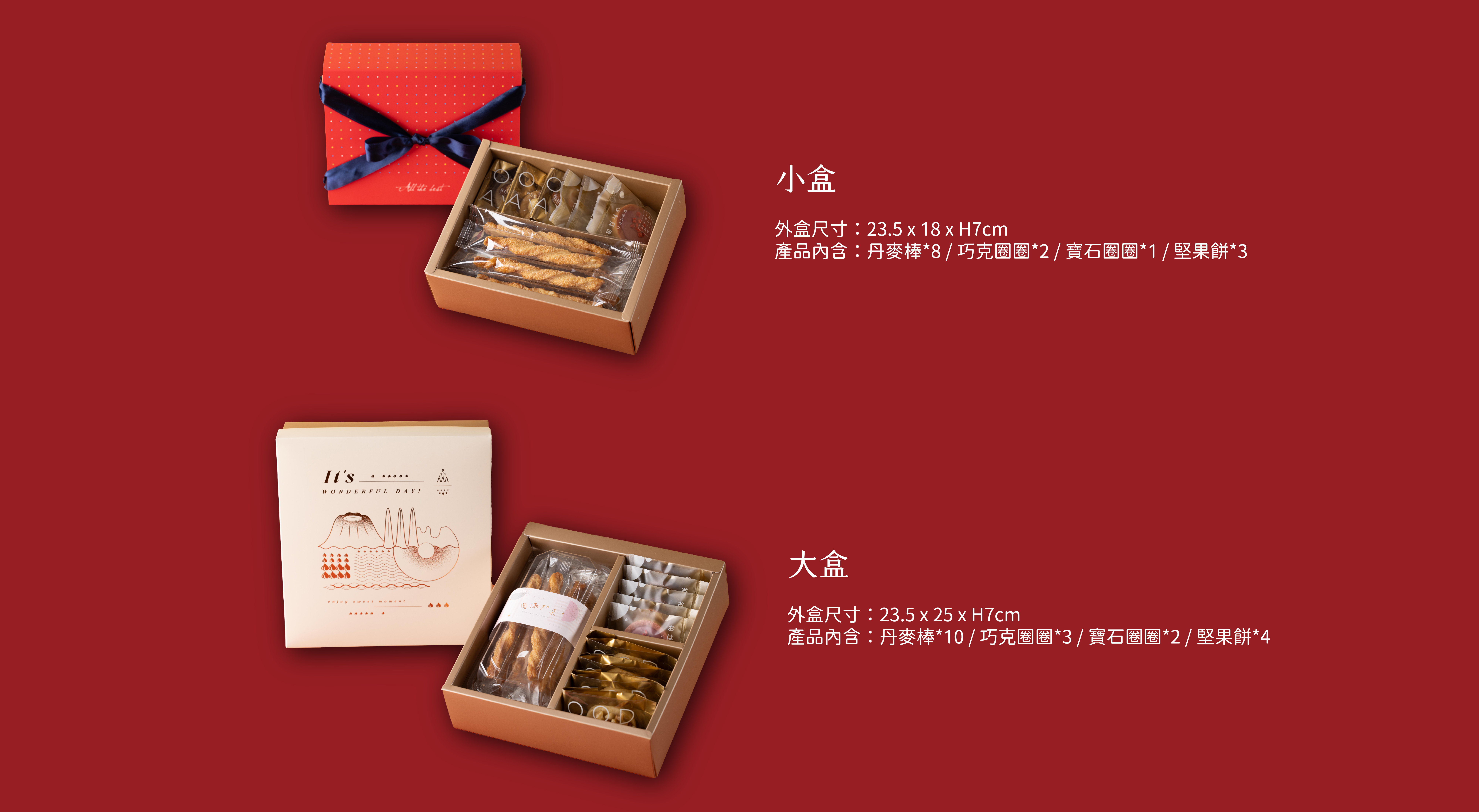 大盒:丹麥棒*10 / 巧克圈圈*3 / 寶石圈圈*2 / 堅果餅*4