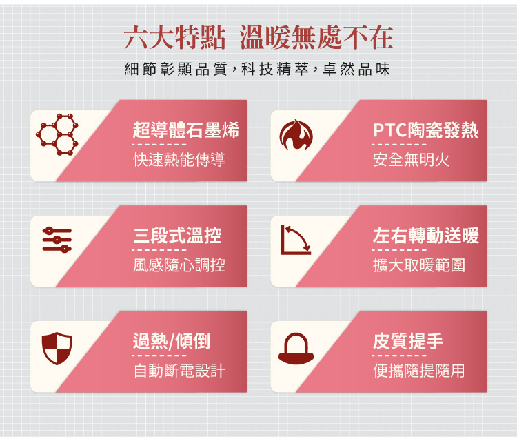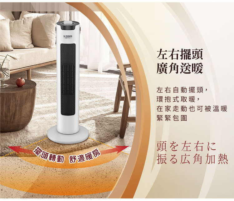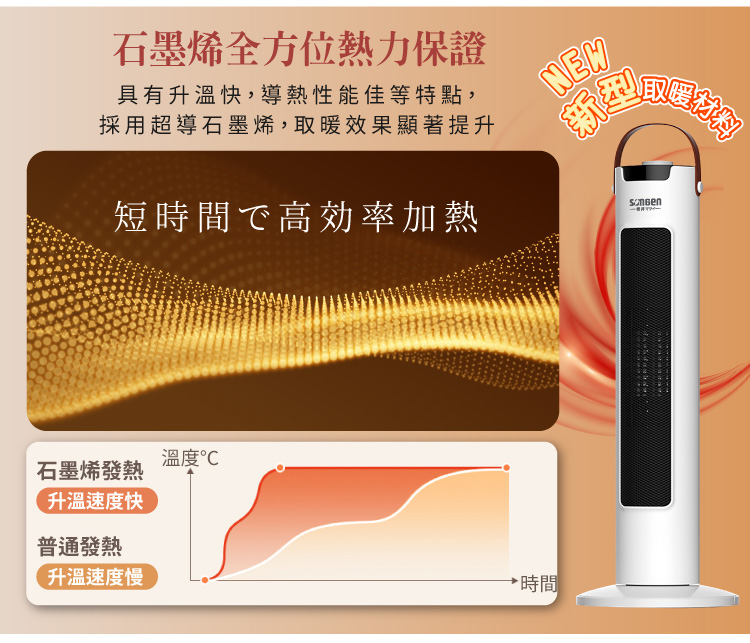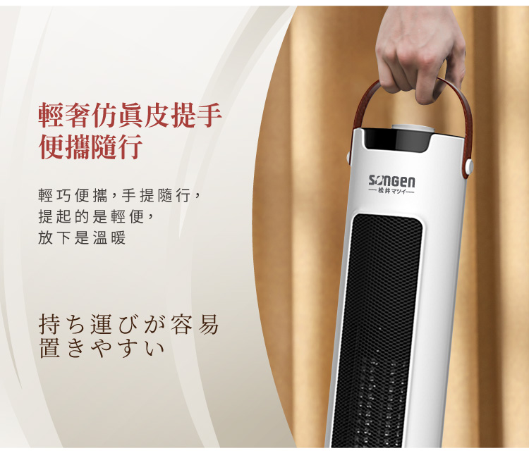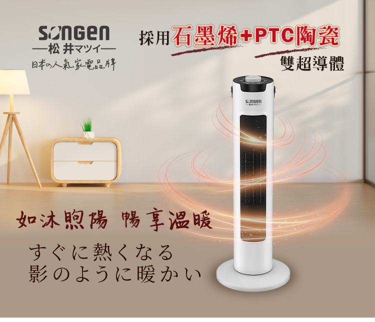 商品特色採用石墨烯+PTC陶瓷雙超導體 無光害、無噪音、無耗氧、無輻射 防傾倒裝置,安全更安心 三段強度溫度設定,暖熱可控 旋鈕式調控,安全恆溫 可左右旋轉,廣角送暖商品規格商品品牌:SONGEN松井 商品型號:SG-073TC 額定電壓及額定頻率:110V / 60Hz 總額定消耗電功率:1200W 商品尺寸:230(寬)x230(深)x610(高)mm 商品重量:1.8KG 加熱類型:PTC陶瓷發熱體+石墨烯塗層BSMI:R73998