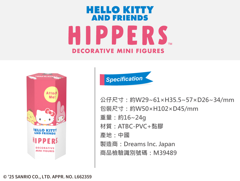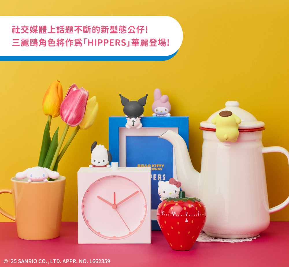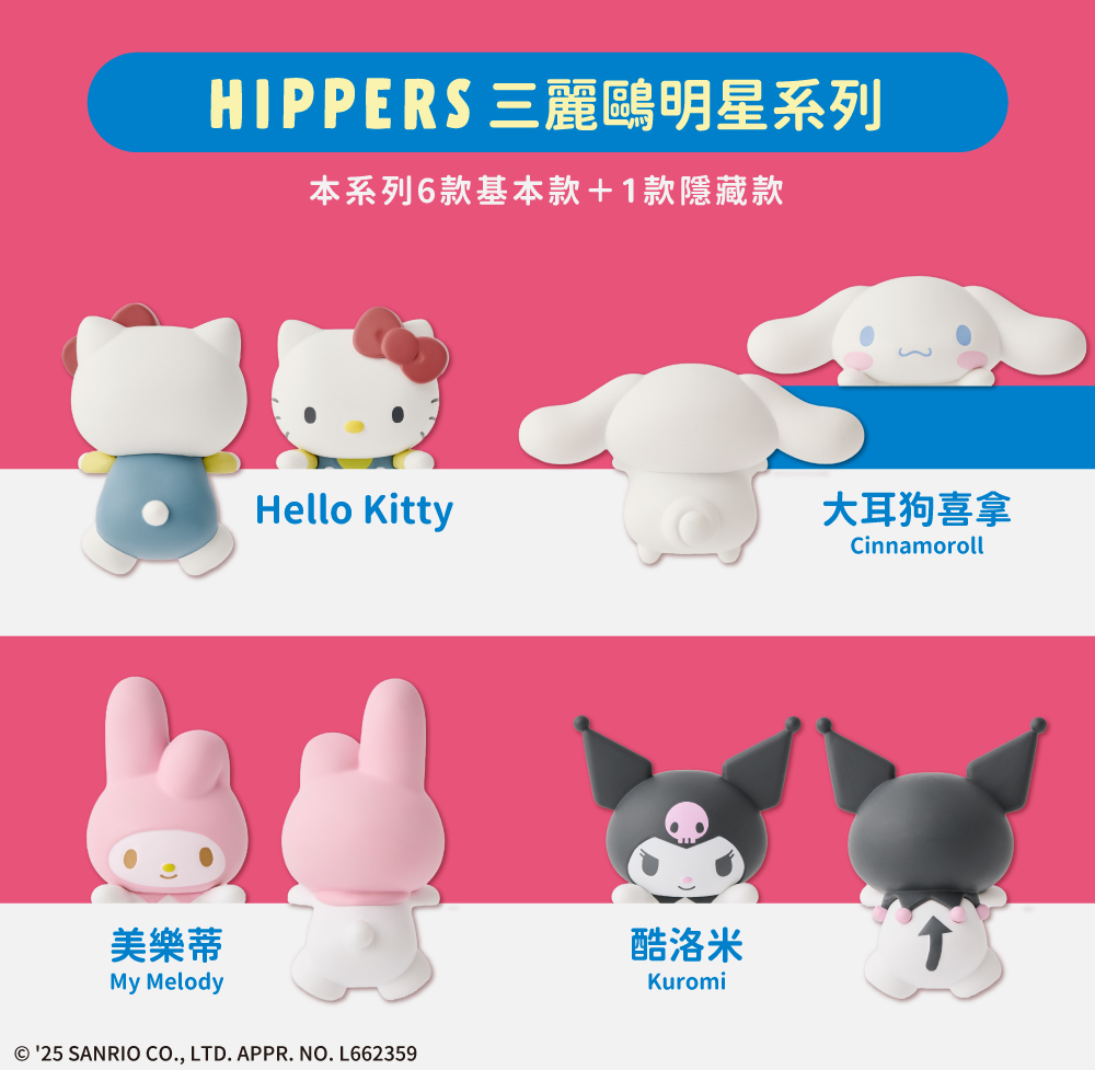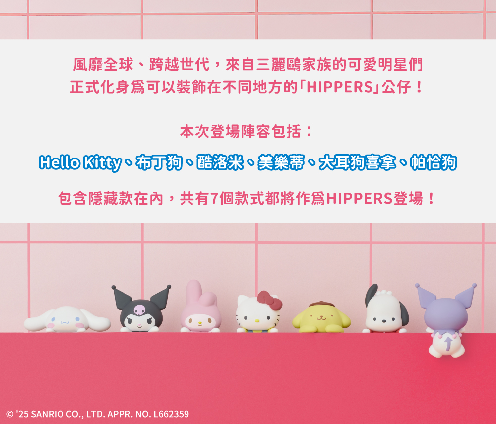 風靡全球、跨越世代,來自三麗鷗家族的可愛明星們,正式化身為可以裝飾在不同地方的「HIPPERS」公仔!本次登場陣容包括:Hello Kitty、布丁狗、酷洛米、美樂蒂、大耳狗喜拿、帕恰狗--包含隱藏款在內,共有7個款式都將作為HIPPERS登場!從前方能看到三麗鷗角色將可愛的小手搭在前面,好奇的觀察、守護著你;從背後則可以欣賞他們圓滾滾的屁股和各具特色的小尾巴。有了三麗鷗明星們的陪伴,一定可以讓你的日常生活更加繽紛可愛!