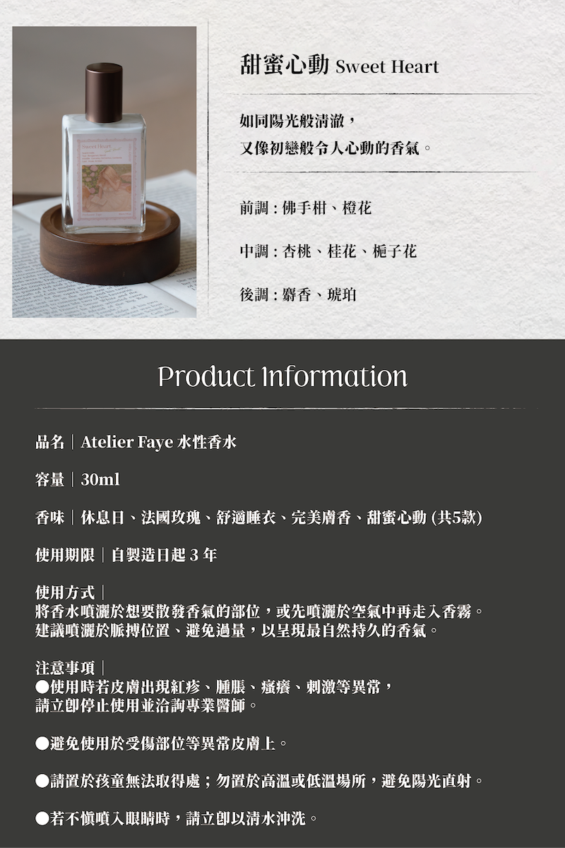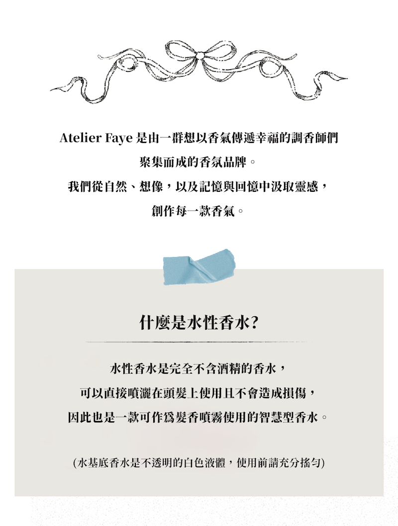 Atelier Faye是一個由韓國調香師們組成的香氣品牌從自然、想像、記憶與回憶之中擷取靈感把一段段情緒化成柔軟的香味水性香水的香氣更貼近皮膚沒有酒精的刺激感是一種像霧一樣的存在輕、溫柔、舒服