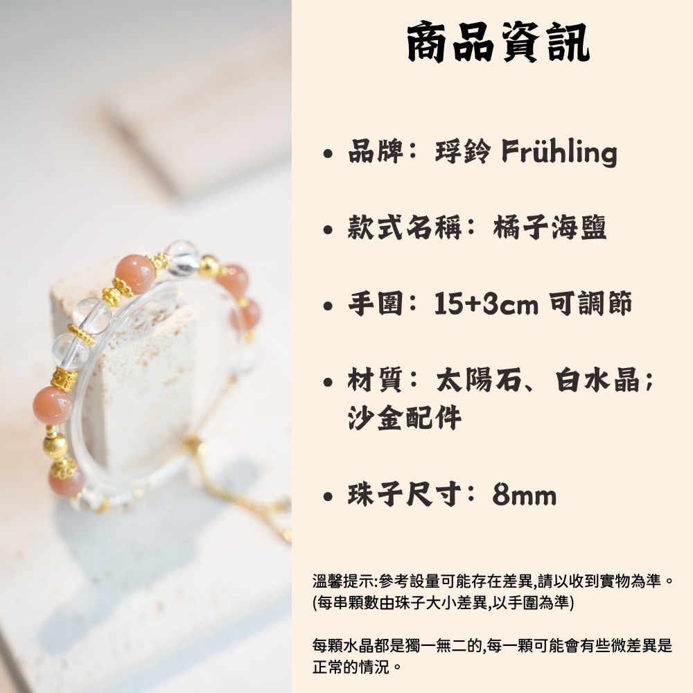 商品內容:品牌名稱:琈鈴 Frühling產品名稱:橘子海鹽 橘曜海韻手環