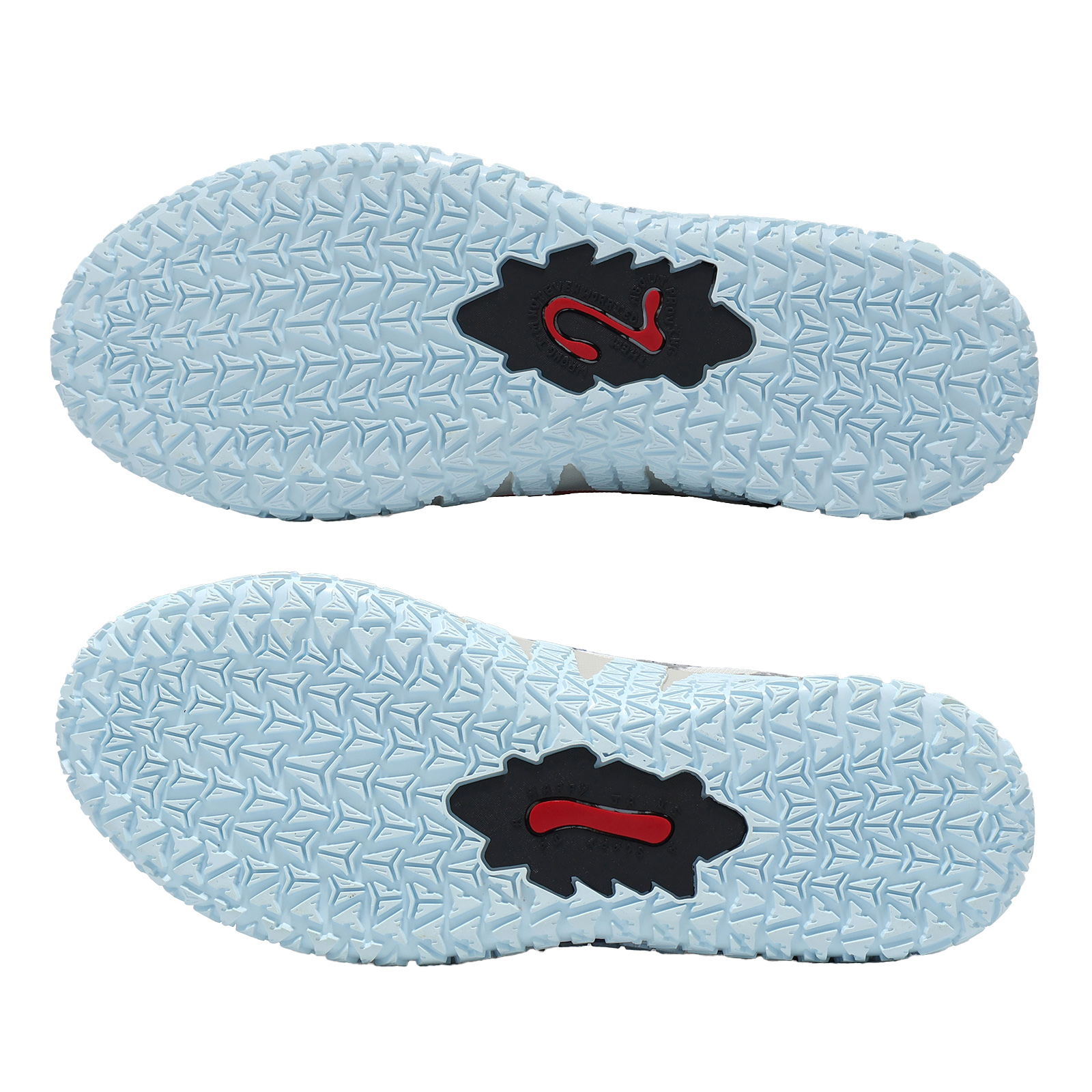 * 鞋面三層結構設計,外側劃痕顆粒物為 PU 鑄模工藝提升局部耐用性,中層及底層為雙層精密網眼布提升透氣性能。
