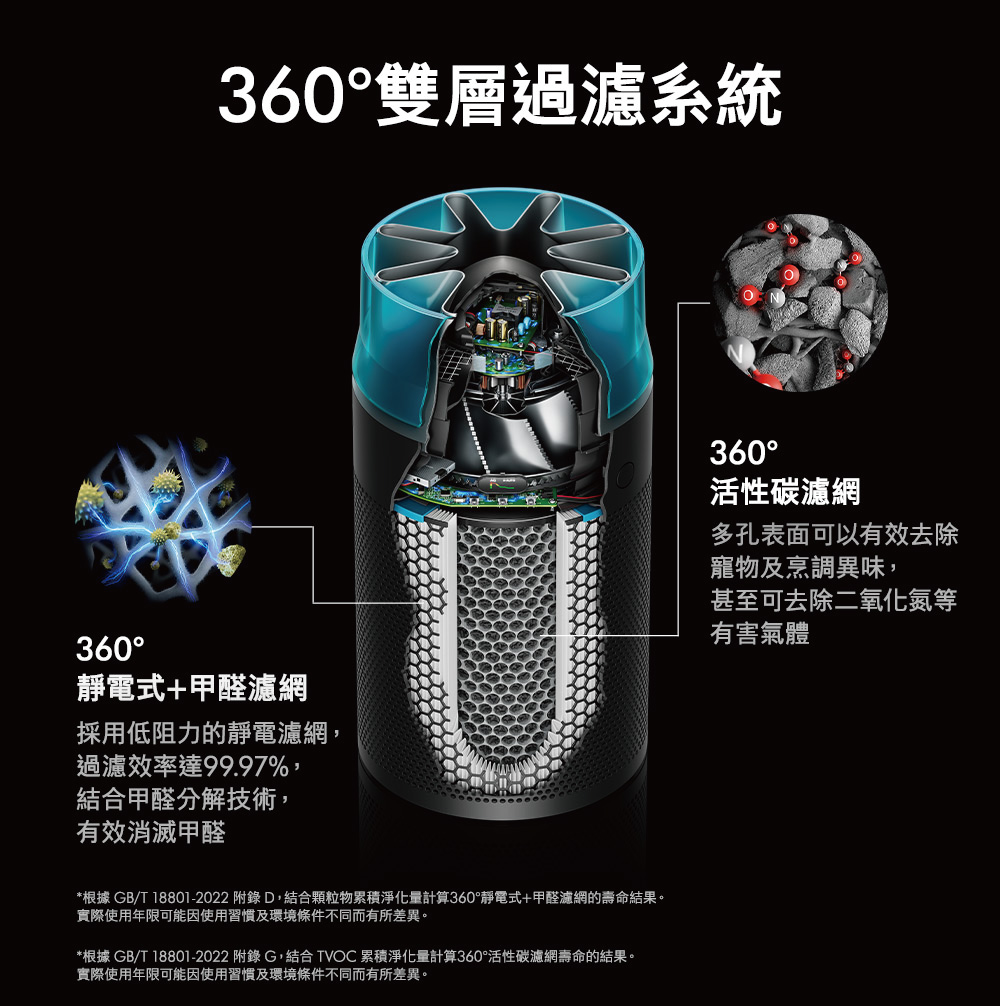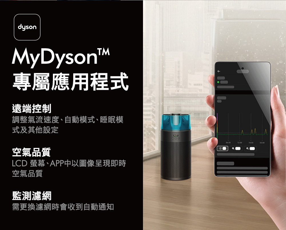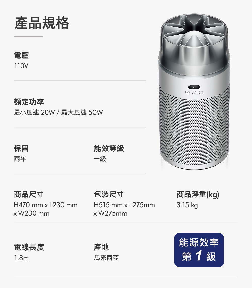 Dyson 強效、小巧且寧靜空氣清新機。濾網壽命長達5年。有效捕捉H1N1、EV71病毒、人類冠狀病毒OC43、花粉過敏原、金黄色葡萄球菌、大腸桿菌、肺炎鏈球菌、貓杯狀病毒、貓皮屑過敏原霉菌過敏原, 以及高達99.97%小至0.3微米的微粒。高效淨化30平方米空間,達到250m3/h CADR 。高效進行全室空氣淨化。睡眠模式下僅24分貝,寧靜地進行淨化。
