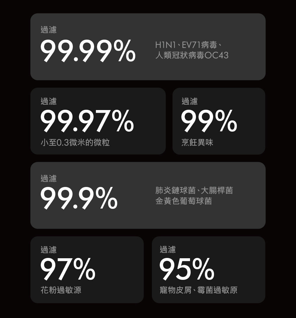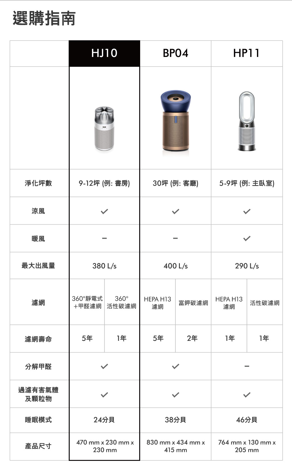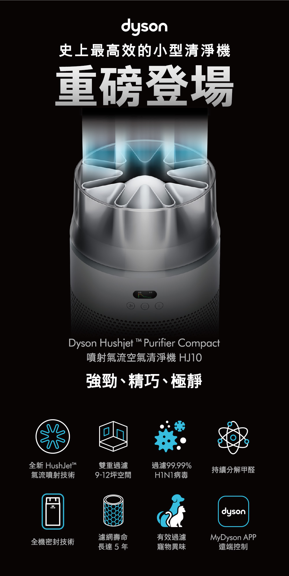 Dyson 強效、小巧且寧靜空氣清新機。濾網壽命長達5年。有效捕捉H1N1、EV71病毒、人類冠狀病毒OC43、花粉過敏原、金黄色葡萄球菌、大腸桿菌、肺炎鏈球菌、貓杯狀病毒、貓皮屑過敏原霉菌過敏原, 以及高達99.97%小至0.3微米的微粒。高效淨化30平方米空間,達到250m3/h CADR 。高效進行全室空氣淨化。睡眠模式下僅24分貝,寧靜地進行淨化。
