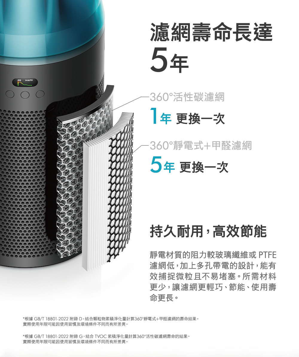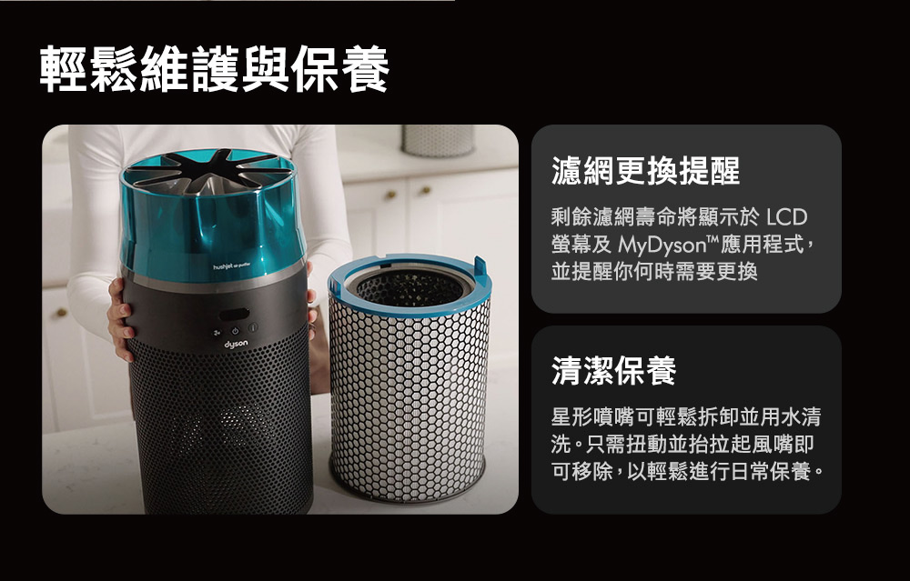 ●全新 HushJet™ 氣流噴射技術。●持續消滅分解甲醛。●濾網壽命長達 5 年。●全機密封技術,備有密封濾網與整部機器密封,將所有污染物牢牢鎖住。●強效且寧靜,睡眠模式下僅 24 分貝。●CADR達 250m3/h,高效淨化9-12坪空間。●自動感應偵測、進行淨化。●LCD 螢幕實時報告室內空氣品質,讓你時刻了解所吸入的空氣品質。●My Dyson APP 遠端控制。●使用兼容的語音服務,如 Amazon Alexa、Google Assistant 或 Siri,進行語音控制。●剩餘濾網壽命將顯示於 LCD 屏幕及 MyDyson™ 應用程式中,以提示你何時需要更換濾網。