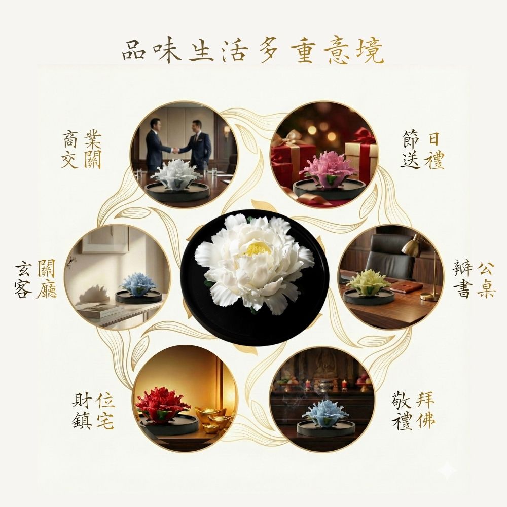 牡丹花香盅可重複使用,將擴香原精滴於花瓣表面,香氣自然擴散,不需點火、不插電,適合居家、書房、玄關等空間。外型典雅大方,寓意圓滿富足,非常適合 新年、春節、長輩拜年、企業送禮、重要節慶 的質感選擇。