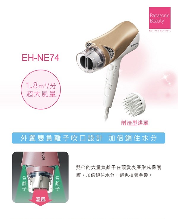 型號:EH-NE74-N顏色:香檳金商品尺寸:寬9.2*高22.5*長21.2cm外箱包裝尺寸cm(寬*高*深):15*33*13商品重量:530g (不含烘罩)烘罩重量:170g消耗功率:1400WBSMI:R31417保固:1年產地:泰國