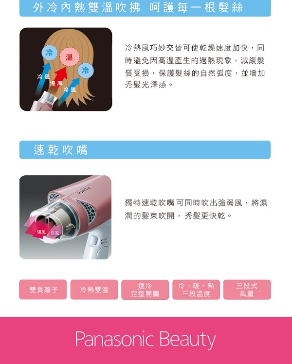 溫冷雙風設計雙負離子出口加倍保濕速冷定型鍵 快速冷風定型搭配速乾吹嘴內附定型烘罩*1