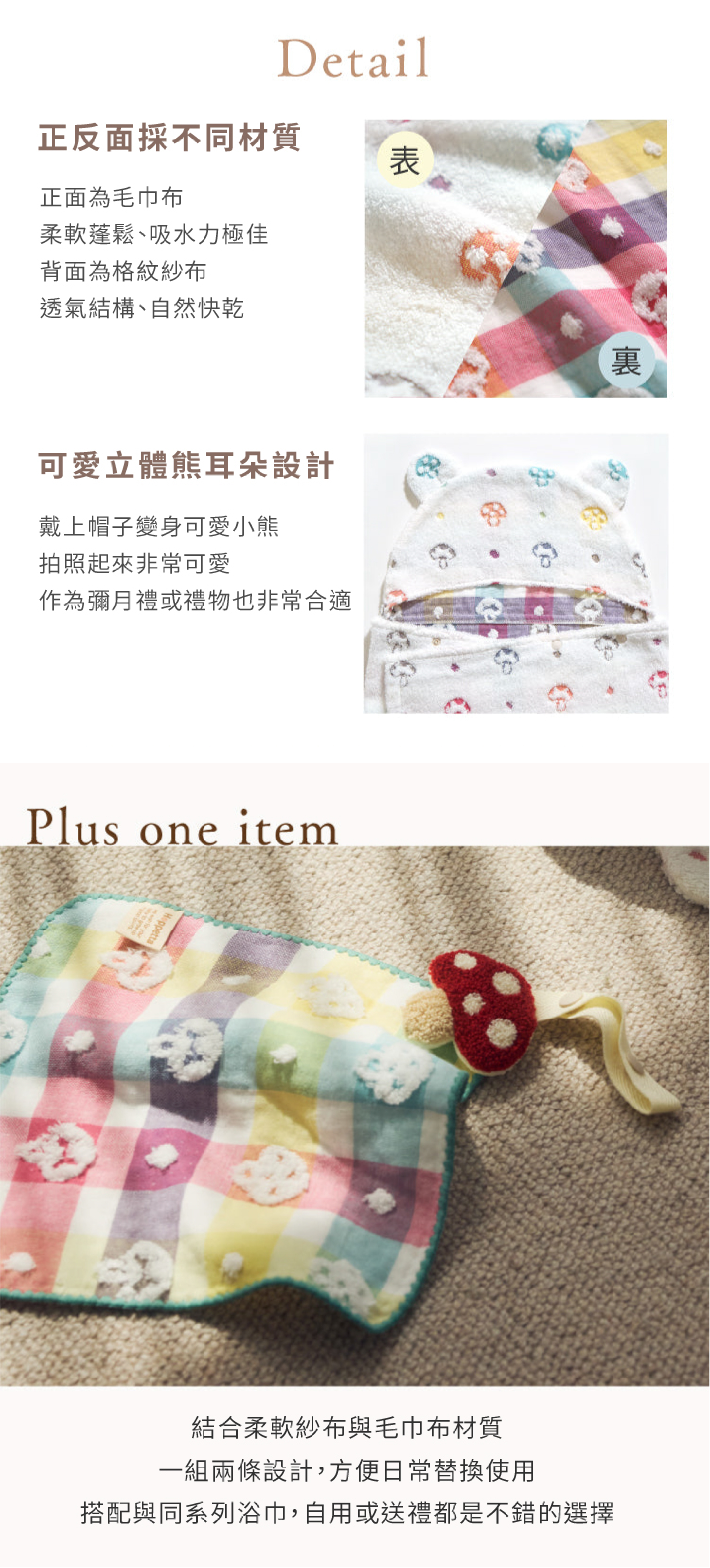 幸運蘑菇圖案結合可愛熊耳造型,柔軟毛巾布包裹寶寶肌膚,吸水快乾又保暖。從新生兒到7歲皆可使用,不論沐浴後、戲水時或外出保暖都實用便利。內層採透氣紗布材質,外層柔軟蓬鬆,親膚舒適不悶熱。