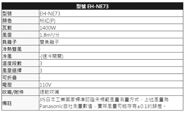 型號:EH-NE73-P顏色:粉色商品尺寸:長 21.2 * 寬 9.2 * 高 22.5 cm外箱包裝尺寸cm(寬*高*深):15*33*13商品重量:530g消耗功率:1400W電源規格:110V/60HZBSMI:R31417 保固:1年產地:泰國