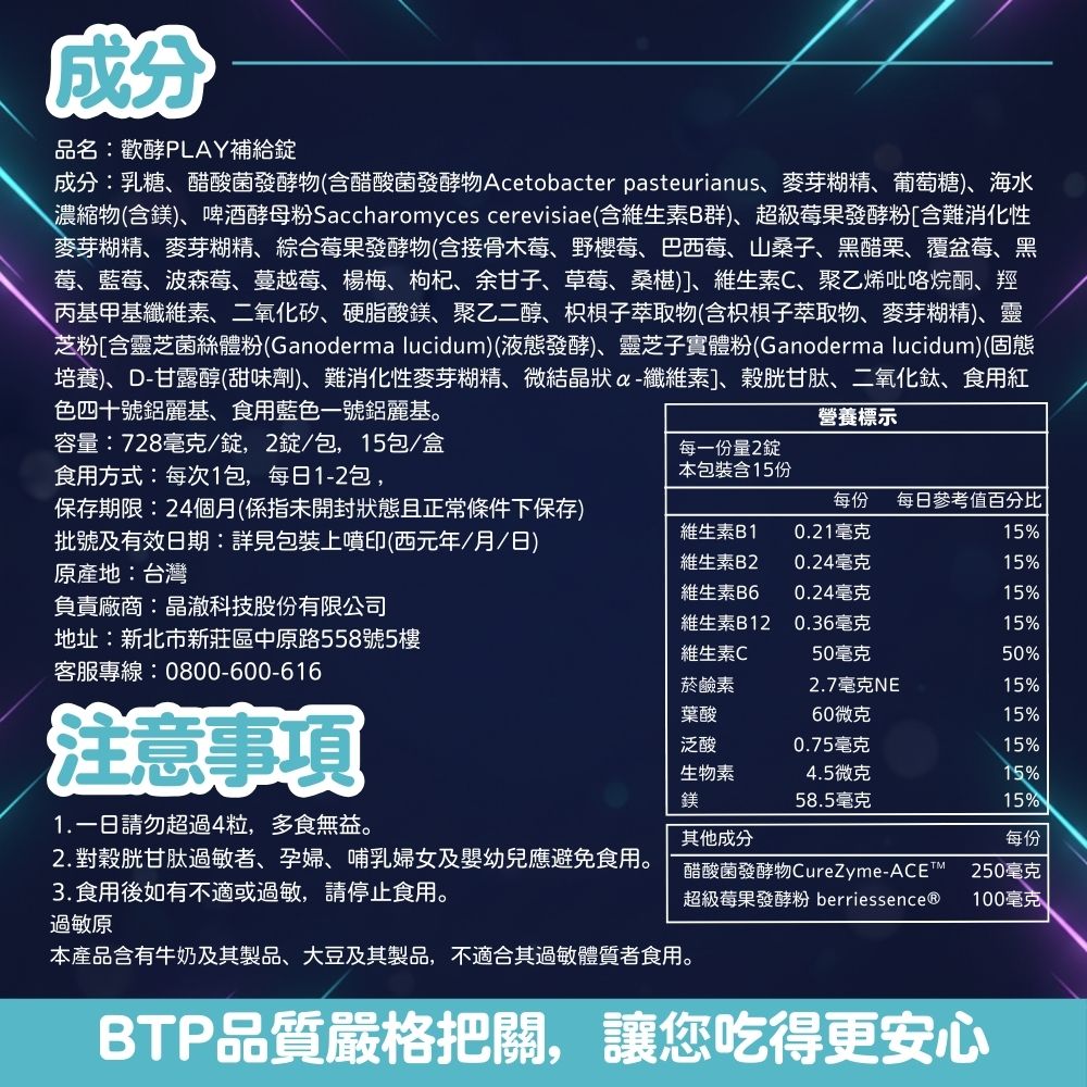 乳糖、醋酸菌發酵物(含醋酸菌發酵物Acetobacter pasteurianus、麥芽糊精、葡萄糖)、海水濃縮物(含鎂)、啤酒酵母粉Saccharomyces cerevisiae(含維生素B群)、超級莓果發酵粉[含難消化性麥芽糊精、麥芽糊精、綜合莓果發酵物(含接骨木莓、野櫻莓、巴西莓、山桑子、黑醋栗、覆盆莓、黑莓、藍莓、波森莓、蔓越莓、楊梅、枸杞、余甘子、草莓、桑椹)]、維生素C、聚乙烯吡咯烷酮、羥丙基甲基纖維素、二氧化矽、硬脂酸鎂、聚乙二醇、枳梖子萃取物(含枳梖子萃取物、麥芽糊精)、靈芝粉[含靈芝菌絲體粉(Ganoderma lucidum)(液態發酵)、靈芝子實體粉(Ganoderma lucidum)(固態培養)、D-甘露醇(甜味劑)、難消化性麥芽糊精、微結晶狀α-纖維素]、穀胱甘肽、二氧化鈦、食用紅色四十號鋁麗基、食用藍色一號鋁麗基。