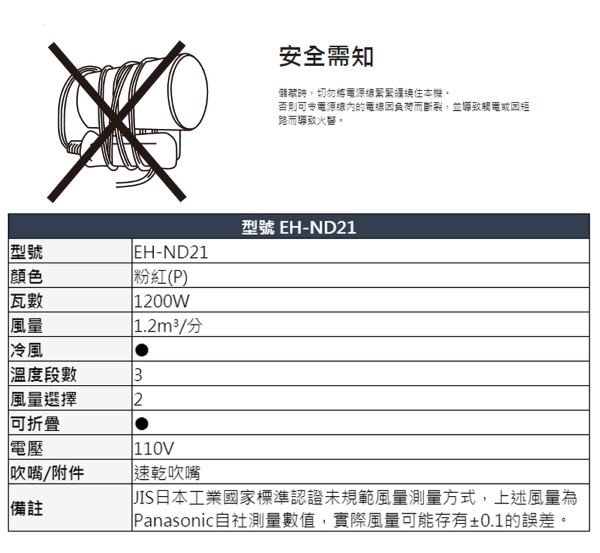 Panasonic 國際牌 速乾型冷熱吹風機 EH-ND21