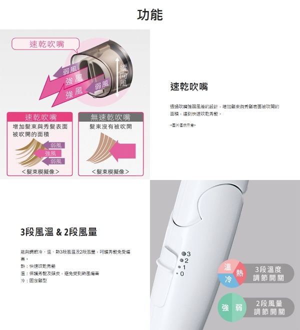 速乾護髮吹嘴風量均勻實現快速乾髮效率冷風設計,乾燥速度加快,減緩髮質受損,保護髮絲自然弧度冷、暖、熱三段溫度強/弱兩種風壓 風量均勻實現快速乾髮效率