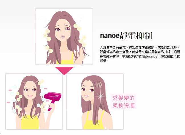 奈米水離子潤澤滲透護髮科技小型輕量化設計,吹整輕鬆1400W大風量設計三段溫度/二段風量設計50⁰C柔風溫控加頭髮的保濕度/提高頭髮的亮澤感頭皮到髮尾完整保養維持頭皮清爽健康靜電抑制握把