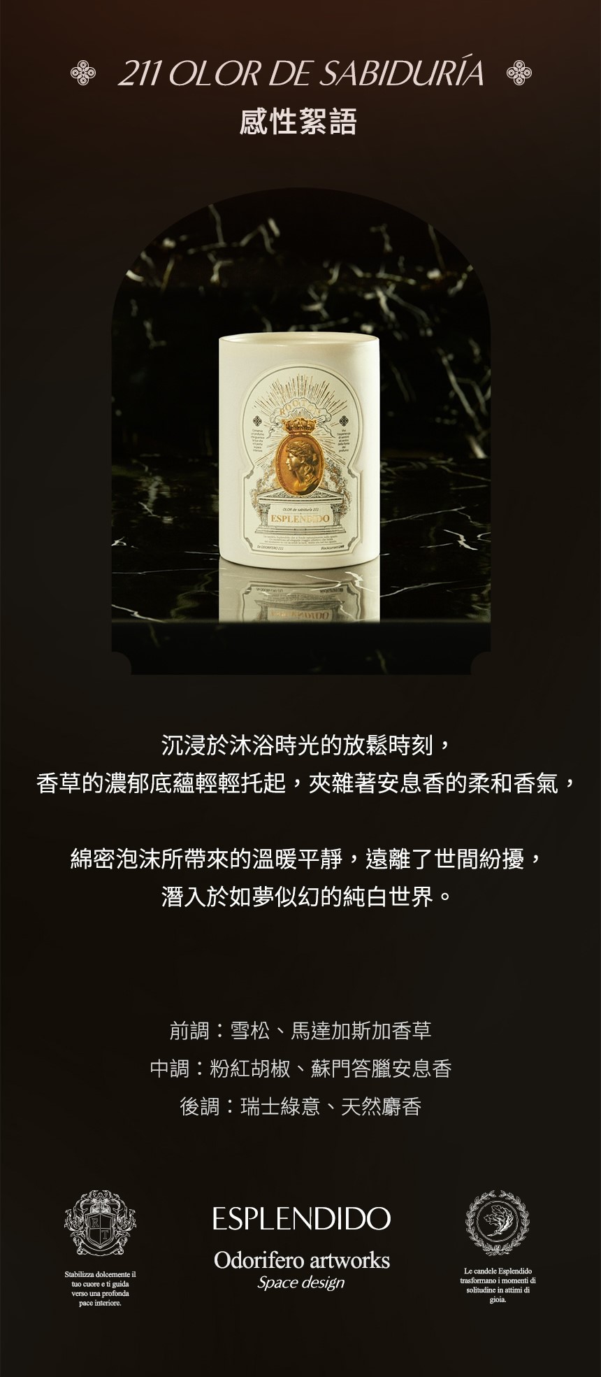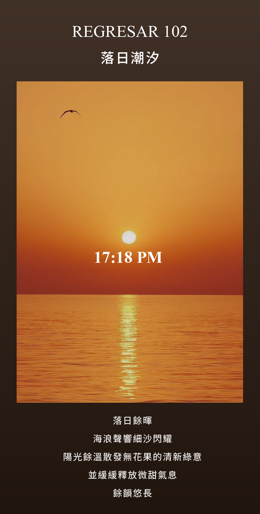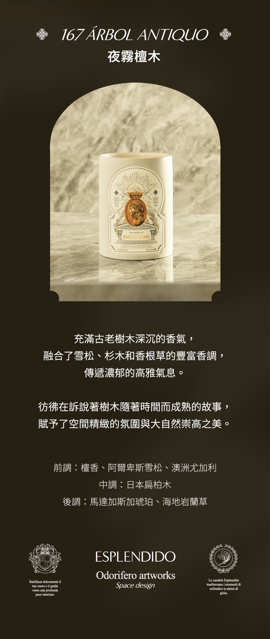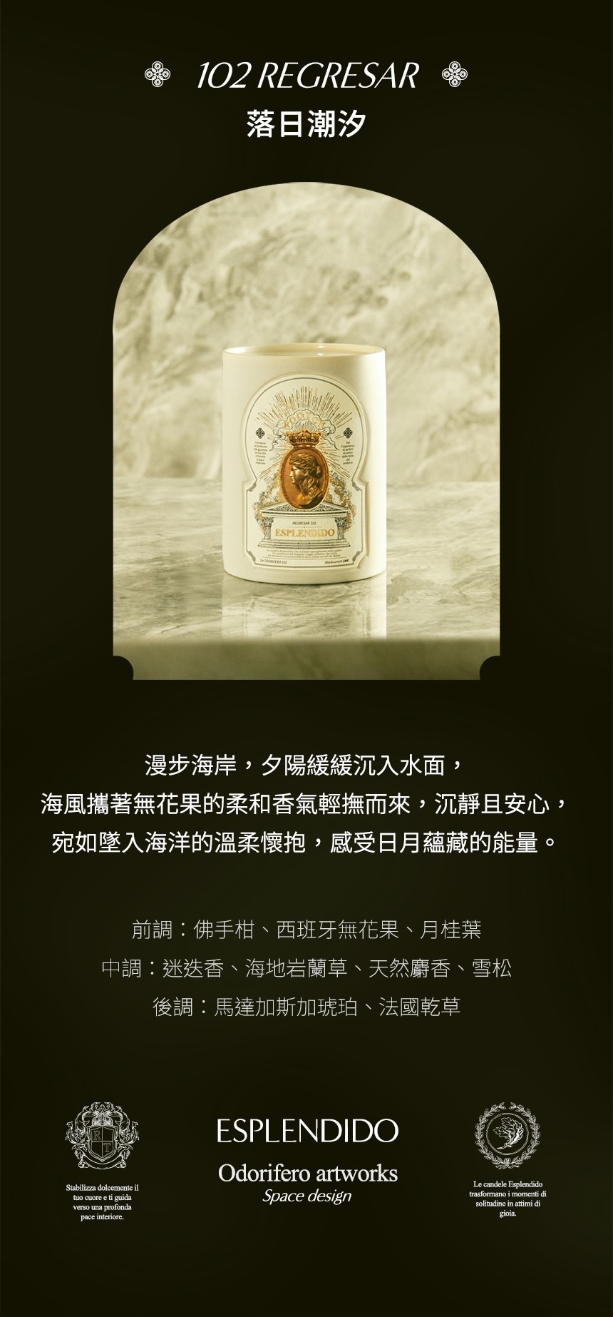 【產品介紹】.REGRESAR 102 落日潮汐 | 果香x木質調雪松、琥珀、無花果相互交織,安心的氣息撲鼻而來.Árbol ANTIQUO 167 夜霧檀木 | 木質調月亮高掛,闔上雙眼享受寧靜,燃燒燻木蘊含沉穩的琥珀.OLOR de SabidurÍa 211 感性絮語 | 乳香調濃醇甜香底蘊,一股細膩麝香輕巧地攀上肌膚