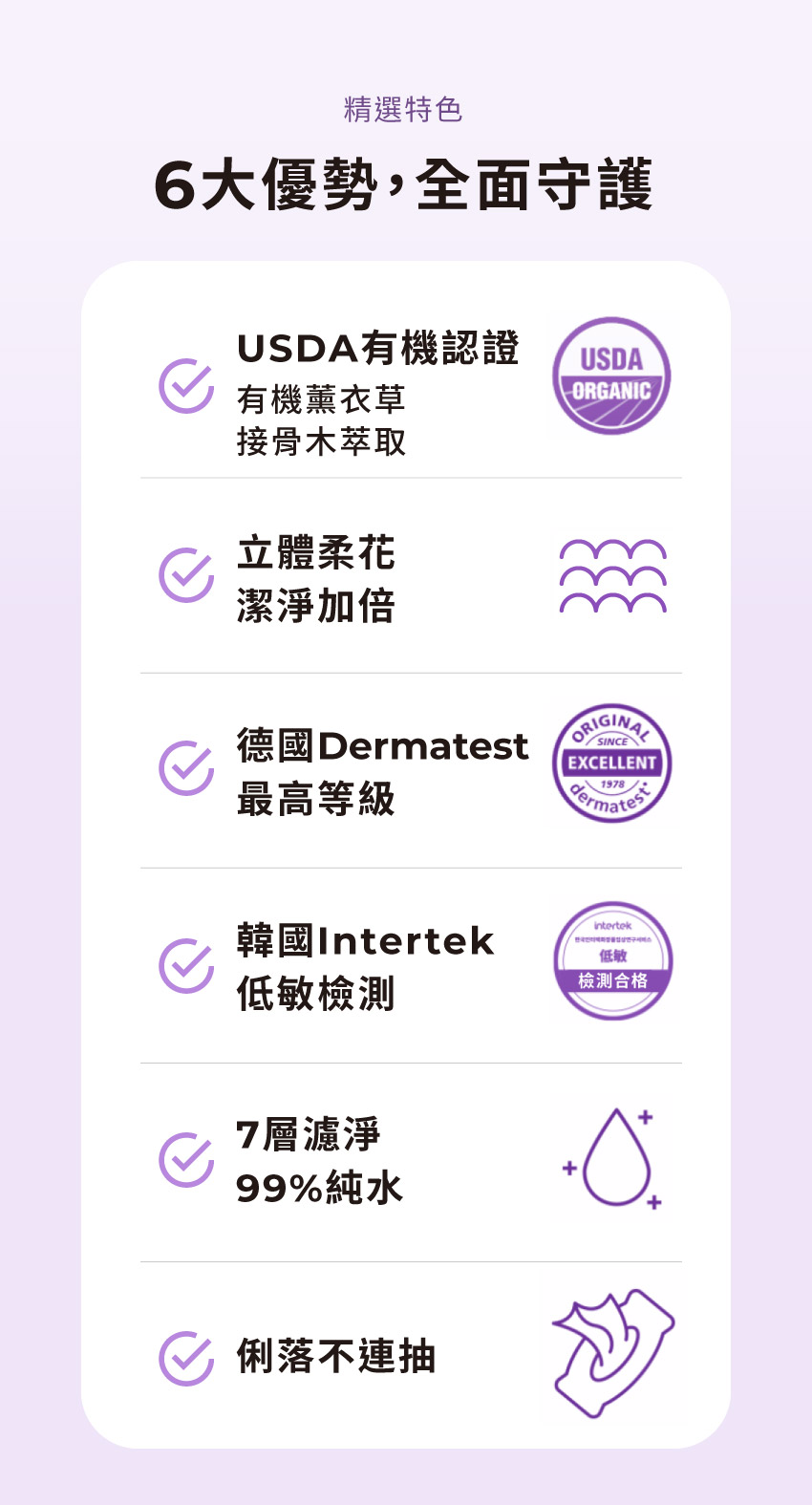 濕紙巾商品特色:LALAPOPO 薰衣草奢厚濕紙巾70抽(掀蓋款) x 3包奢厚 × 有機 × 低敏安心USDA有機薰衣草|好療癒立體柔花壓紋|潔淨柔韌高磅數65gsm|厚實不易破7道精密淨化純水|濕潤不黏膩通過德國 Dermatest 最高認證俐落不連抽|單手抽取不卡手