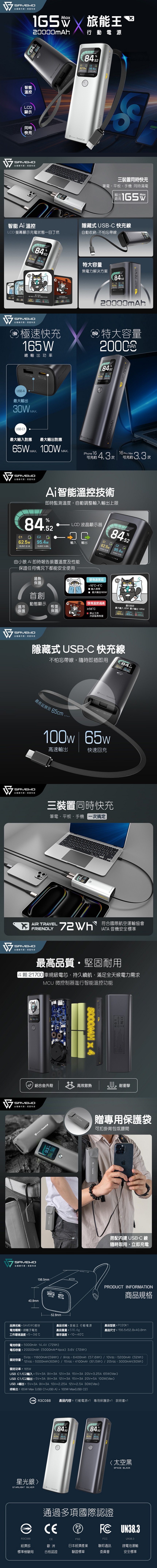 ■ 超強電力支援:擁有最高165W總輸出功率,高達20000mAh 3.6V 72Wh特大容量■ 無論是筆記型電腦、平板還是手機,都能快速充電,讓你隨時保持高效原創AI智能溫控:即時監控溫度,調整輸入輸出上限,確保使用安全同保護電池,防止溫度過冷過熱,延長使用壽命,並以LCD生動清晰顯示!讓你無需擔心充電過程中的安全問題■ 內置隱藏式USB-C線:自動收納,支援100W高速放電及65W回充,最長延展至約65cm!■ 同時為三個裝置充電:高效又省時!■ 堅固耐用:採用高強度鋁鎂合金外殼,堅固耐用,高效散熱。■ 車規級電芯:採用4粒車規級21700電芯,持久續航,滿足你長時間的電力需求!■ 航安認可:符合國際航空運輸協會(IATA)及 中國強制性產品認證 (CCC) 的登機安全標準,可安心隨身攜帶上機