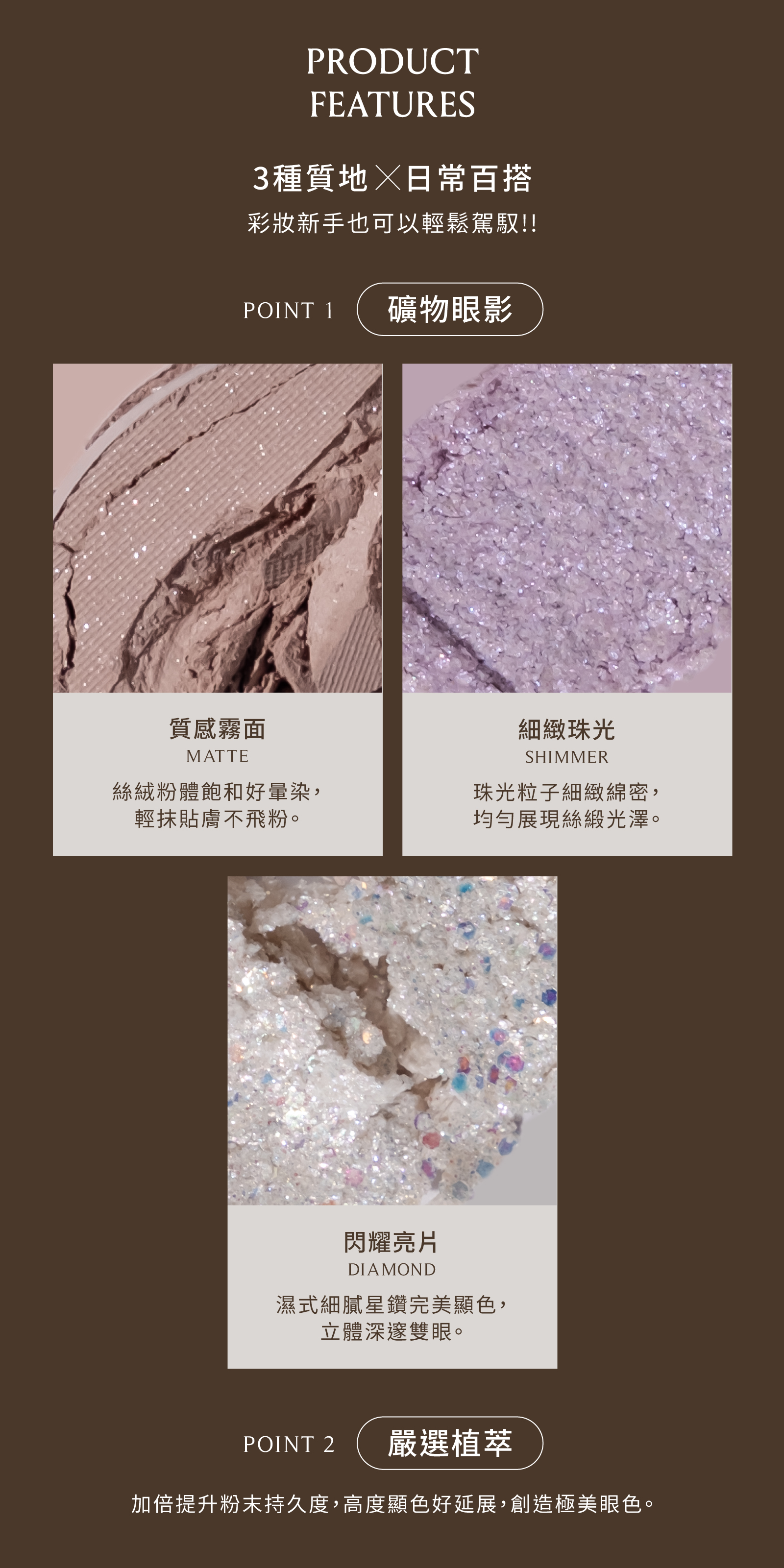精選六色礦物眼彩,添加多重保濕萃取,細緻粉末呈現絲緞光澤,